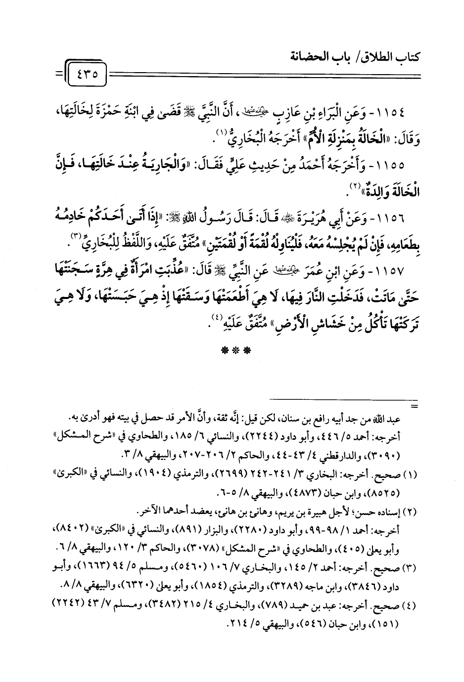 1154 - وَعَنِ الْبَرَاءِ بْنِ عَازِبِ رَضِيَ اللَّهُ عَنْهُمَا، أَنَّ النَّبِيَّ - صلى الله عليه وسلم - قَضَى فِي ابْنَةِ حَمْزَةَ لِخَالَتِهَا، وَقَالَ: «الْخَالَةُ بِمَنْزِلَةِ الْأُمِّ» أَخْرَجَهُ الْبُخَارِيُّ (¬1).