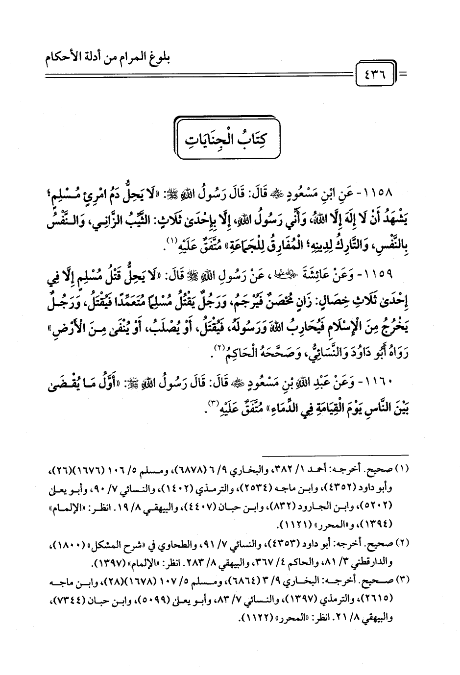 1158 - عَنِ ابْنِ مَسْعُودٍ - رضي الله عنه - قَالَ: قَالَ رَسُولُ اللَّهِ - صلى الله عليه وسلم -: «لَا يَحِلُّ دَمُ امْرِئٍ مُسْلِمٍ; يَشْهَدُ أَنْ لَا إِلَهَ إِلَّا اللَّهُ، وَأَنِّي رَسُولُ اللَّهِ، إِلَّا بِإِحْدَى ثَلَاثٍ: الثَّيِّبُ الزَّانِي، وَالنَّفْسُ بِالنَّفْسِ، وَالتَّارِكُ لِدِينِهِ; الْمُفَارِقُ لِلْجَمَاعَةِ» مُتَّفَقٌ عَلَيْهِ (¬1).
