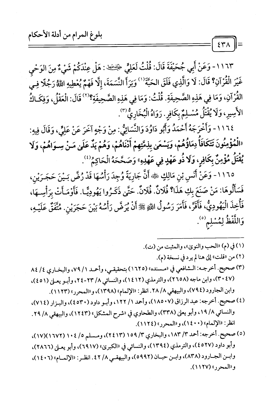 1163 - وَعَنْ أَبِي جُحَيْفَةَ قَالَ: قُلْتُ لَعَلِيٍّ رَضِيَ اللَّهُ عَنْهُمَا: هَلْ عِنْدَكُمْ شَيْءٌ مِنَ الوَحْيِ غَيْرَ الْقُرْآنِ? قَالَ: لَا وَالَّذِي فَلَقَ الحَبَّةَ (¬1) وَبَرَأَ النَّسَمَةَ، إِلَّا فَهْمٌ يُعْطِيهِ اللَّهُ رَجُلًا فِي القُرْآنِ، وَمَا فِي هَذِهِ الصَّحِيفَةِ. قُلْتُ: وَمَا فِي هَذِهِ الصَّحِيفَةِ? (¬2) قَالَ: الْعَقْلُ، وَفِكَاكُ الأَسِيرِ، وَلَا يُقْتَلُ مُسْلِمٌ بِكَافِرٍ. رَوَاهُ الْبُخَارِيُّ (¬3).