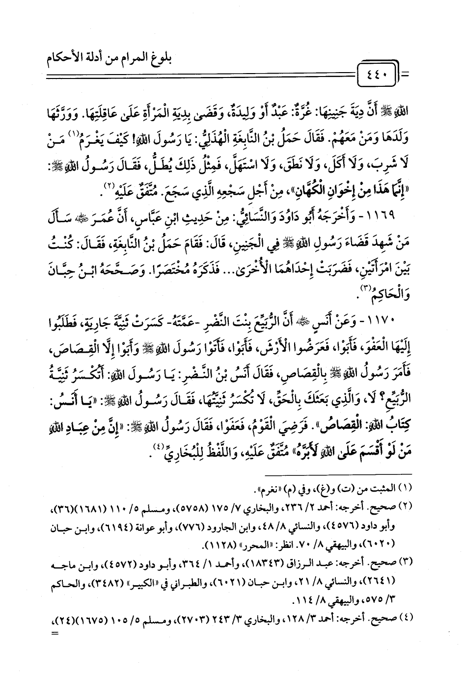1170 - وَعَنْ أَنَسٍ - رضي الله عنه - أَنَّ الرُّبَيِّعَ بِنْتَ النَّضْرِ -عَمَّتَهُ- كَسَرَتْ ثَنِيَّةَ جَارِيَةٍ، فَطَلَبُوا إِلَيْهَا الْعَفْوَ، فَأَبَوْا، فَعَرَضُوا الْأَرْشَ، فَأَبَوْا، فَأَتَوْا رَسُولَ اللَّهِ - صلى الله عليه وسلم - وَأَبَوْا إِلَّا الْقِصَاصَ، فَأَمَرَ رَسُولُ اللَّهِ - صلى الله عليه وسلم - بِالْقِصَاصِ، فَقَالَ أَنَسُ بْنُ النَّضْرِ: يَا رَسُولَ اللَّهِ: أَتُكْسَرُ ثَنِيَّةُ الرُّبَيِّعِ? لَا، وَالَّذِي بَعَثَكَ بِالْحَقِّ، لَا تُكْسَرُ ثَنِيَّتُهَا، فَقَالَ رَسُولُ اللَّهِ - صلى الله عليه وسلم -: «يَا أَنَسُ: كِتَابُ اللَّهِ: الْقِصَاصُ». فَرَضِيَ الْقَوْمُ، فَعَفَوْا، فَقَالَ رَسُولُ اللَّهِ - صلى الله عليه وسلم -: «إِنَّ مِنْ عِبَادِ اللَّهِ مَنْ لَوْ أَقْسَمَ عَلَى اللَّهِ لَأَبَرَّهُ» مُتَّفَقٌ عَلَيْهِ، وَاللَّفْظُ لِلْبُخَارِيِّ (¬1).