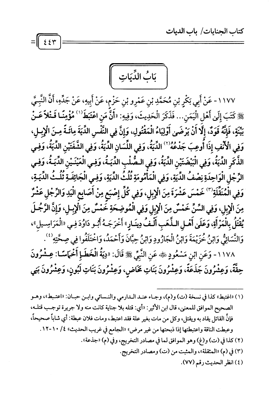 1177 - عَنْ أَبِي بَكْرٍ بْنِ مُحَمَّدِ بْنِ عَمْرِو بْنِ حَزْمٍ، عَنْ أَبِيهِ، عَنْ جَدِّهِ، أَنَّ النَّبِيَّ - صلى الله عليه وسلم - كَتَبَ إِلَى أَهْلِ الْيَمَنِ ... فَذَكَرَ الْحَدِيثَ، وَفِيهِ: «أَنَّ مَنِ اعْتَبَطَ (¬1) مُؤْمِنًا قَتْلاً عَنْ بَيِّنَةٍ، فَإِنَّهُ قَوَدٌ، إِلَّا أَنْ يَرْضَى أَوْلِيَاءُ الْمَقْتُولِ، وَإِنَّ فِي النَّفْسِ الدِّيَةَ مِائَةً مِنَ الْإِبِلِ، وَفِي الْأَنْفِ إِذَا أُوعِبَ جَدْعُهُ (¬2) الدِّيَةُ، وَفِي اللِّسَانِ الدِّيَةُ، وَفِي الشَّفَتَيْنِ الدِّيَةُ، وَفِي الذَّكَرِ الدِّيَةُ، وَفِي الْبَيْضَتَيْنِ الدِّيَةُ، وَفِي الصُّلْبِ الدِّيَةُ، وَفِي الْعَيْنَيْنِ الدِّيَةُ، وَفِي الرِّجْلِ الْوَاحِدَةِ نِصْفُ الدِّيَةِ، وَفِي الْمَأْمُومَةِ ثُلُثُ الدِّيَةِ، وَفِي الْجَائِفَةِ ثُلُثُ الدِّيَةِ، وَفِي الْمُنَقِّلَةِ (¬3)