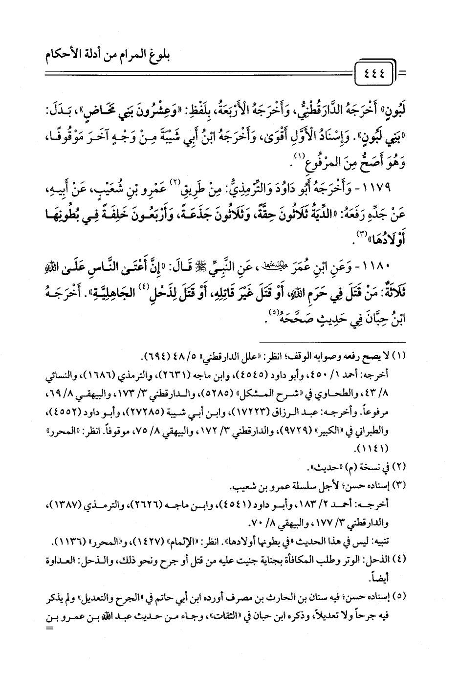 1180 - وَعَنِ ابْنِ عُمَرَ رَضِيَ اللَّهُ عَنْهُمَا، عَنِ النَّبِيِّ - صلى الله عليه وسلم - قَالَ: «إِنَّ أَعْتَى النَّاسِ عَلَى اللَّهِ ثَلَاثَةٌ: مَنْ قَتَلَ فِي حَرَمِ اللَّهِ، أَوْ قَتَلَ غَيْرَ قَاتِلِهِ، أَوْ قَتَلَ لِذَحْلِ (¬1) الجَاهِلِيَّةِ». أَخْرَجَهُ ابْنُ حِبَّانَ فِي حَدِيثٍ صَحَّحَهُ (¬2).