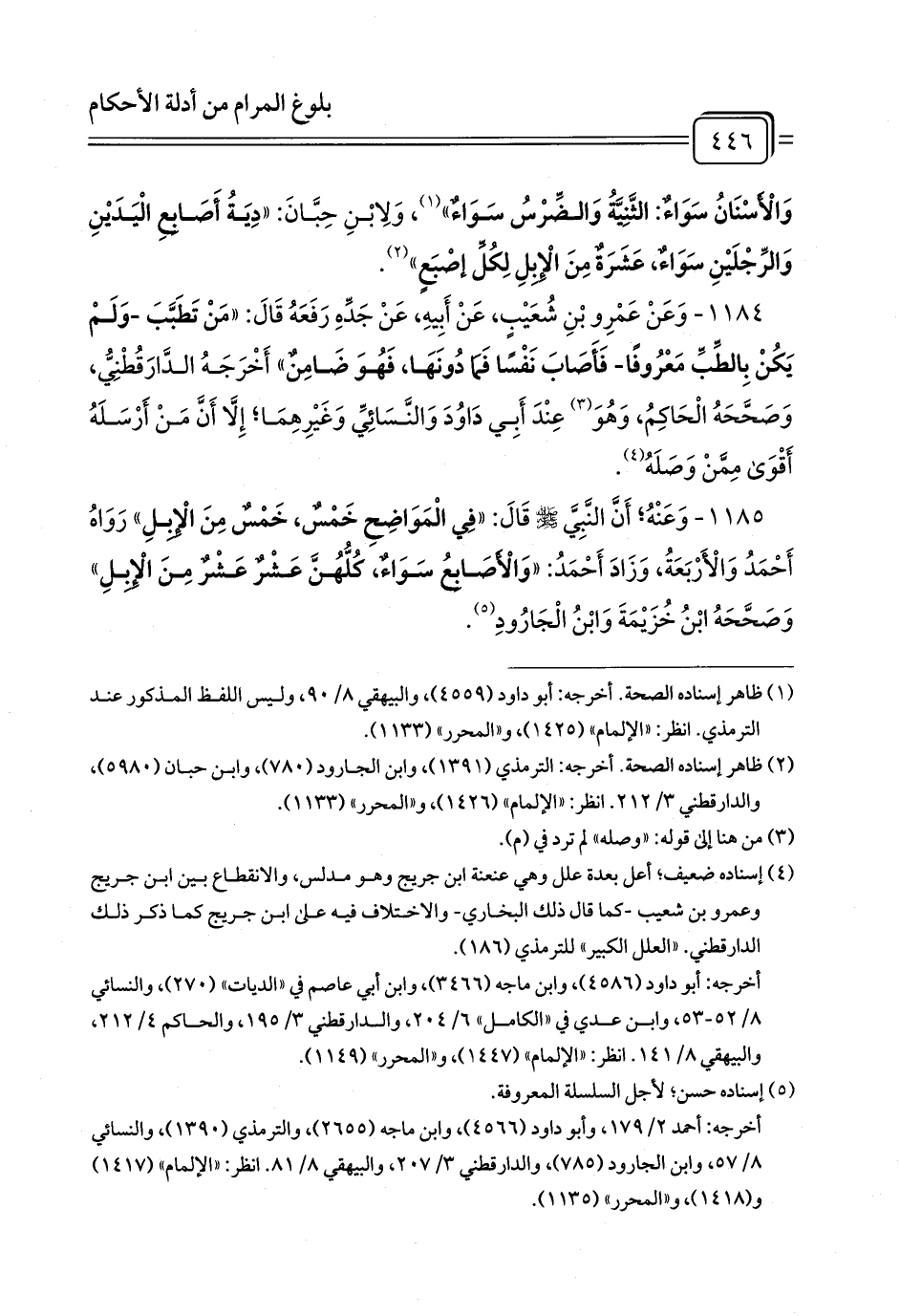 1185 - وَعَنْهُ; أَنَّ النَّبِيَّ - صلى الله عليه وسلم - قَالَ: «فِي الْمَوَاضِحِ خَمْسٌ، خَمْسٌ مِنَ الْإِبِلِ» رَوَاهُ أَحْمَدُ وَالْأَرْبَعَةُ، وَزَادَ أَحْمَدُ: «وَالْأَصَابِعُ سَوَاءٌ، كُلُّهُنَّ عَشْرٌ عَشْرٌ مِنَ الْإِبِلِ» وَصَحَّحَهُ ابْنُ خُزَيْمَةَ وَابْنُ الْجَارُودِ (¬1).