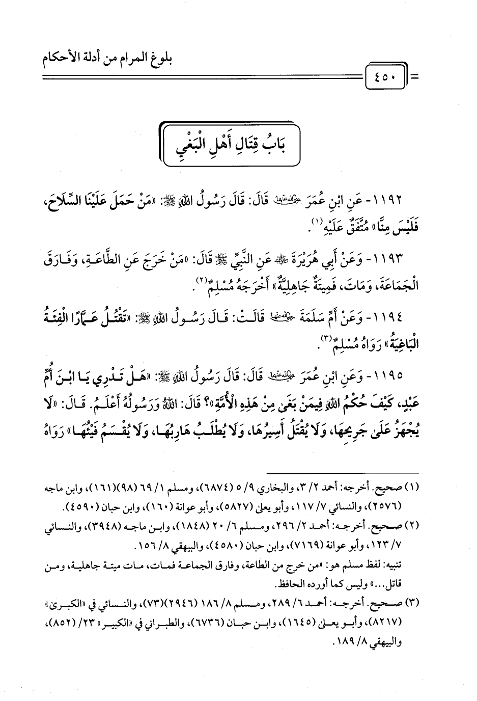 1192 - عَنِ ابْنِ عُمَرَ رِضَيَ اللَّهُ عَنْهُمَا قَالَ: قَالَ رَسُولُ اللَّهِ - صلى الله عليه وسلم -: «مَنْ حَمَلَ عَلَيْنَا السِّلَاحَ، فَلَيْسَ مِنَّا» مُتَّفَقٌ عَلَيْهِ (¬1).