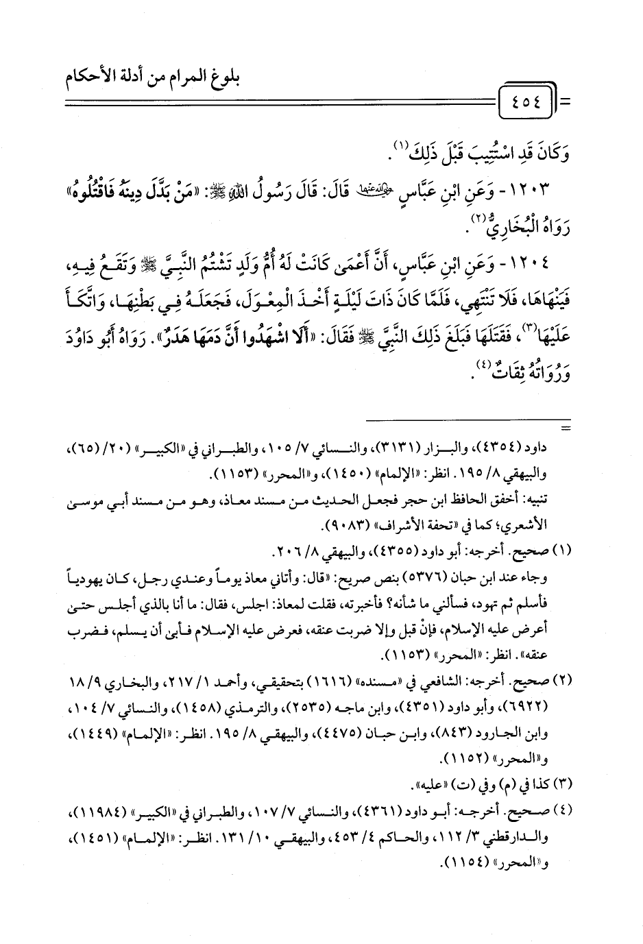 1204 - وَعَنِ ابْنِ عَبَّاسٍ، أَنَّ أَعْمَى كَانَتْ لَهُ أُمُّ وَلَدٍ تَشْتُمُ النَّبِيَّ - صلى الله عليه وسلم - وَتَقَعُ فِيهِ، فَيَنْهَاهَا، فَلَا تَنْتَهِي، فَلَمَّا كَانَ ذَاتَ لَيْلَةٍ أَخْذَ الْمِعْوَلَ، فَجَعَلَهُ فِي بَطْنِهَا، وَاتَّكَأَ عَلَيْهَا (¬1)، فَقَتَلَهَا فَبَلَغَ ذَلِكَ النَّبِيَّ - صلى الله عليه وسلم - فَقَالَ: «أَلَا اشْهَدُوا أَنَّ دَمَهَا هَدَرٌ». رَوَاهُ أَبُو دَاوُدَ وَرُوَاتُهُ ثِقَاتٌ (¬2).