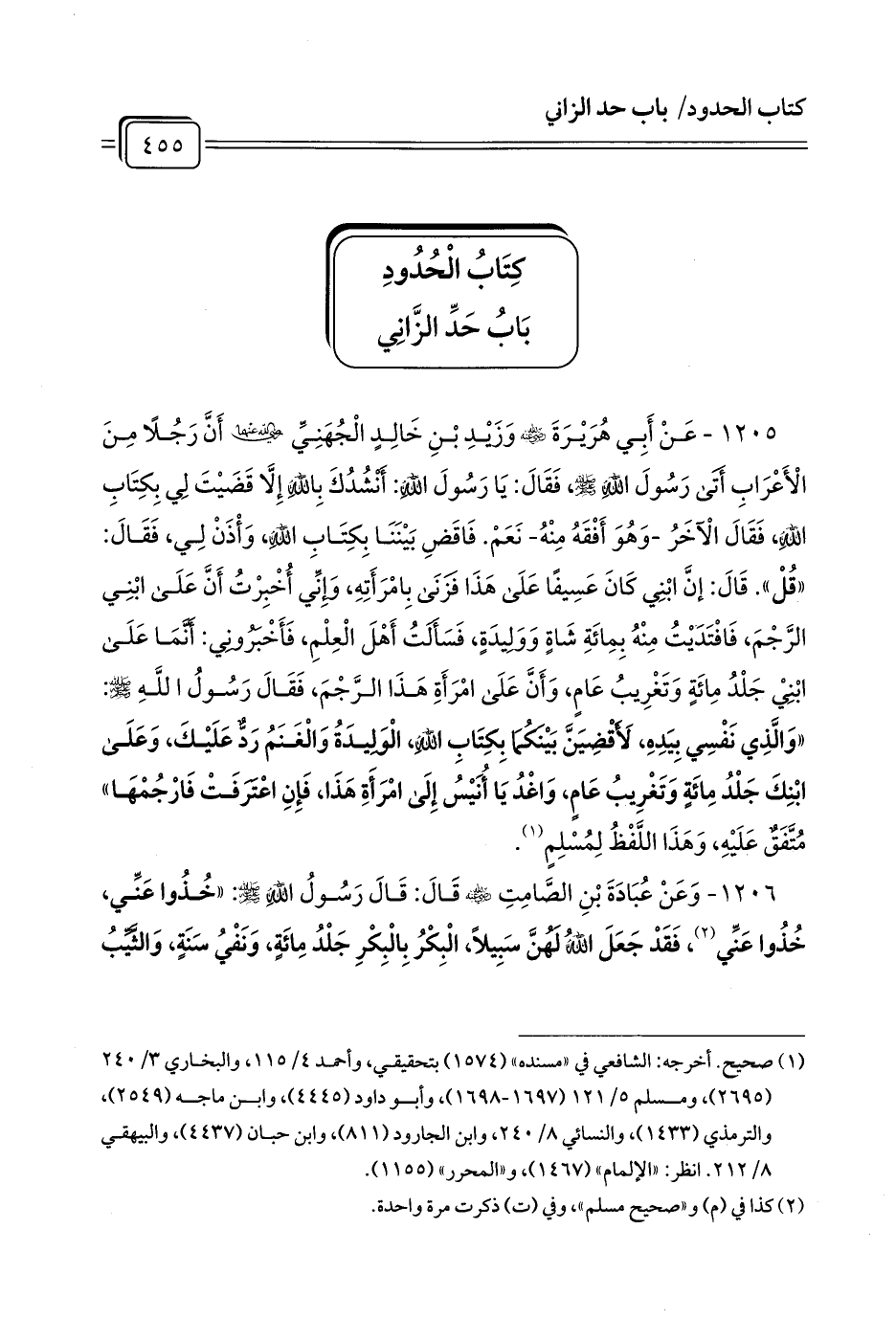 1205 - عَنْ أَبِي هُرَيْرَةَ - رضي الله عنه - وَزَيْدِ بْنِ خَالِدٍ الْجُهَنِيِّ رَضِيَ اللَّهُ عنهما أَنَّ رَجُلًا مِنَ الْأَعْرَابِ أَتَى رَسُولَ اللَّهِ - صلى الله عليه وسلم -، فَقَالَ: يَا رَسُولَ اللَّهِ: أَنْشُدُكَ بِاللَّهِ إِلَّا قَضَيْتَ لِي بِكِتَابِ اللَّهِ، فَقَالَ الْآخَرُ -وَهُوَ أَفْقَهُ مِنْهُ- نَعَمْ. فَاقَضِ بَيْنَنَا بِكِتَابِ اللَّهِ، وَأْذَنْ لِي، فَقَالَ: