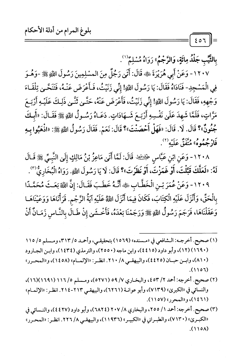 1207 - وَعَنْ أَبِي هُرَيْرَةَ - رضي الله عنه - قَالَ: أَتَى رَجُلٌ مِنَ المسْلِمِينَ رَسُولَ اللَّهِ - صلى الله عليه وسلم - وَهُوَ فِي الْمَسْجِدِ- فَنَادَاهُ فَقَالَ: يَا رَسُولَ اللَّهِ! إِنِّي زَنَيْتُ، فَأَعْرَضَ عَنْهُ، فَتَنَحَّى تِلْقَاءَ وَجْهِهِ، فَقَالَ: يَا رَسُولَ اللَّهِ! إِنِّي زَنَيْتُ، فَأَعْرَضَ عَنْهُ، حَتَّى ثَنَّى ذَلِكَ عَلَيْهِ أَرْبَعَ مَرَّاتٍ، فَلَمَّا شَهِدَ عَلَى نَفْسِهِ أَرْبَعَ شَهَادَاتٍ. دَعَاهُ رَسُولُ اللَّهِ - صلى الله عليه وسلم - فَقَالَ: «أَبِكَ جُنُونٌ» ? قَالَ. لَا. قَالَ: «فَهَلْ أَحْصَنْتَ» ? قَالَ: نَعَمْ. فَقَالَ رَسُولُ اللَّهِ - صلى الله عليه وسلم -: «اذْهَبُوا بِهِ فَارْجُمُوهُ» مُتَّفَقٌ عَلَيْهِ (¬1).