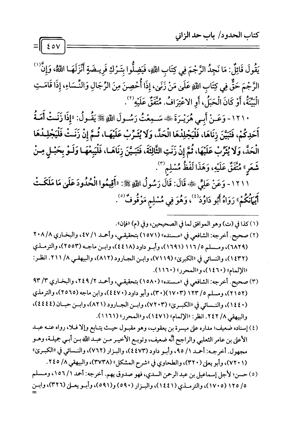 1210 - وَعَنْ أَبِي هُرَيْرَةَ - رضي الله عنه - سَمِعْتُ رَسُولَ اللَّهِ - صلى الله عليه وسلم - يَقُولُ: «إِذَا زَنَتْ أَمَةُ أَحَدِكُمْ، فَتَبَيَّنَ زِنَاهَا، فَلْيَجْلِدْهَا الْحَدَّ، وَلَا يُثَرِّبْ عَلَيْهَا، ثُمَّ إِنْ زَنَتْ فَلْيَجْلِدْهَا الْحَدَّ، وَلَا يُثَرِّبْ عَلَيْهَا، ثُمَّ إِنْ زَنَتِ الثَّالِثَةَ، فَتَبَيَّنَ زِنَاهَا، فَلْيَبِعْهَا وَلَوْ بِحَبْلٍ مِنْ شَعَرٍ» مُتَّفَقٌ عَلَيْهِ، وَهَذَا لَفْظُ مُسْلِمٍ (¬1).