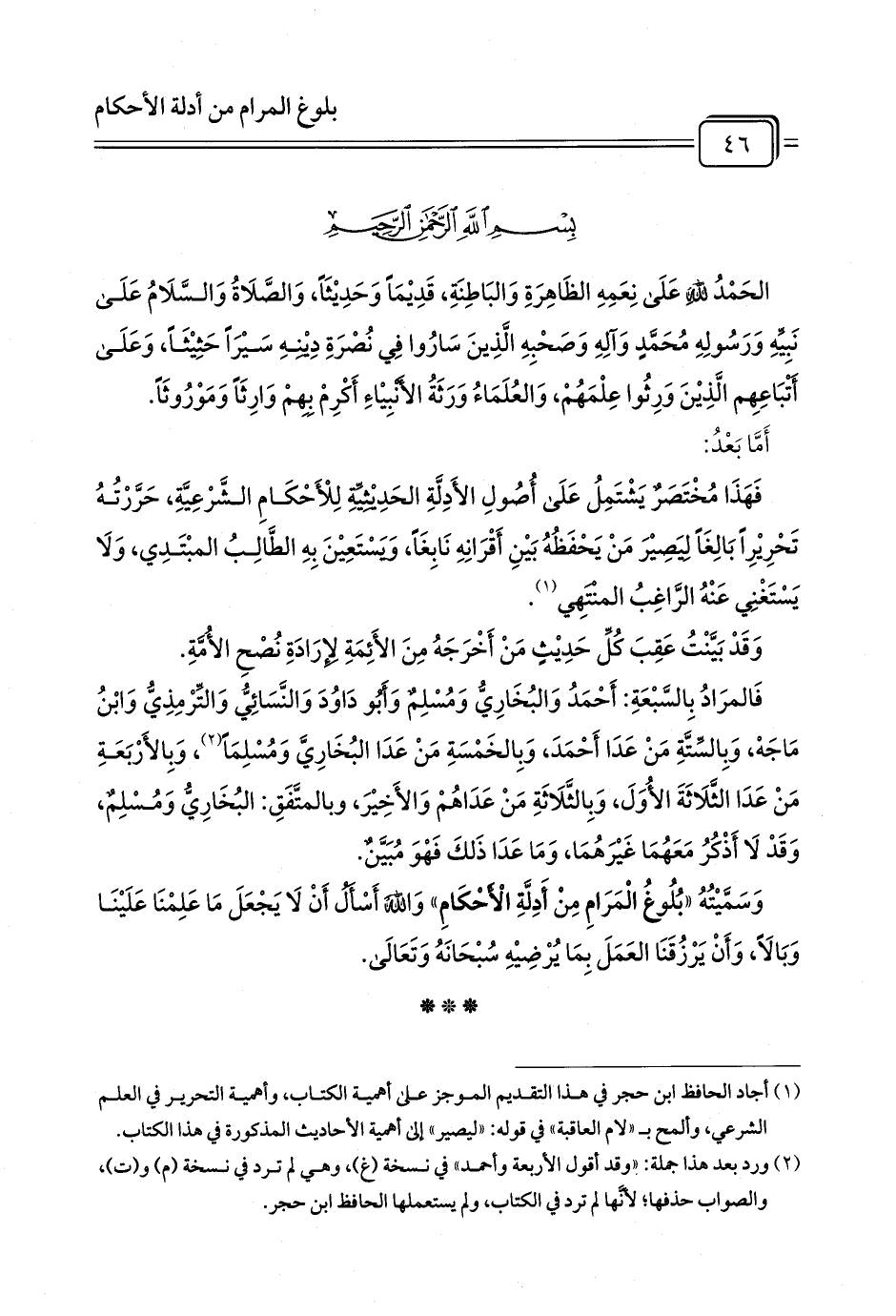 (¬1) أجاد الحافظ ابن حجر في هذا التقديم الموجز على أهمية الكتاب، وأهمية التحرير في العلم الشرعي، وألمح بـ «لام العاقبة» في قوله: «ليصير» إلى أهمية الأحاديث المذكورة في هذا الكتاب.
