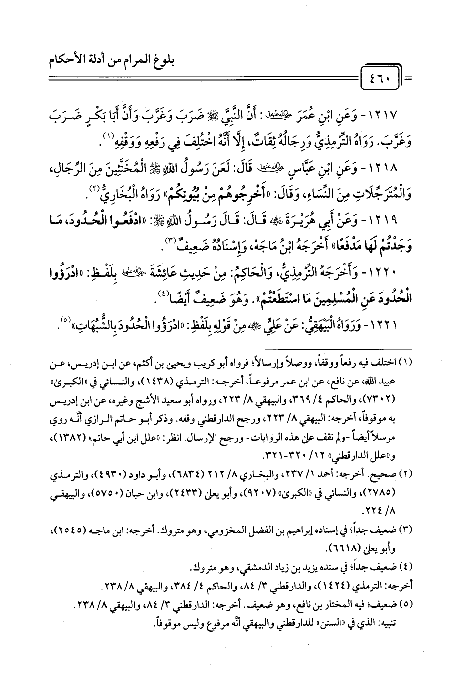 1219 - وَعَنْ أَبِي هُرَيْرَةَ - رضي الله عنه - قَالَ: قَالَ رَسُولُ اللَّهِ - صلى الله عليه وسلم -: «ادْفَعُوا الْحُدُودَ، مَا وَجَدْتُمْ لَهَا مَدْفَعًا» أَخْرَجَهُ ابْنُ مَاجَهْ، وَإِسْنَادُهُ ضَعِيفٌ (¬1).