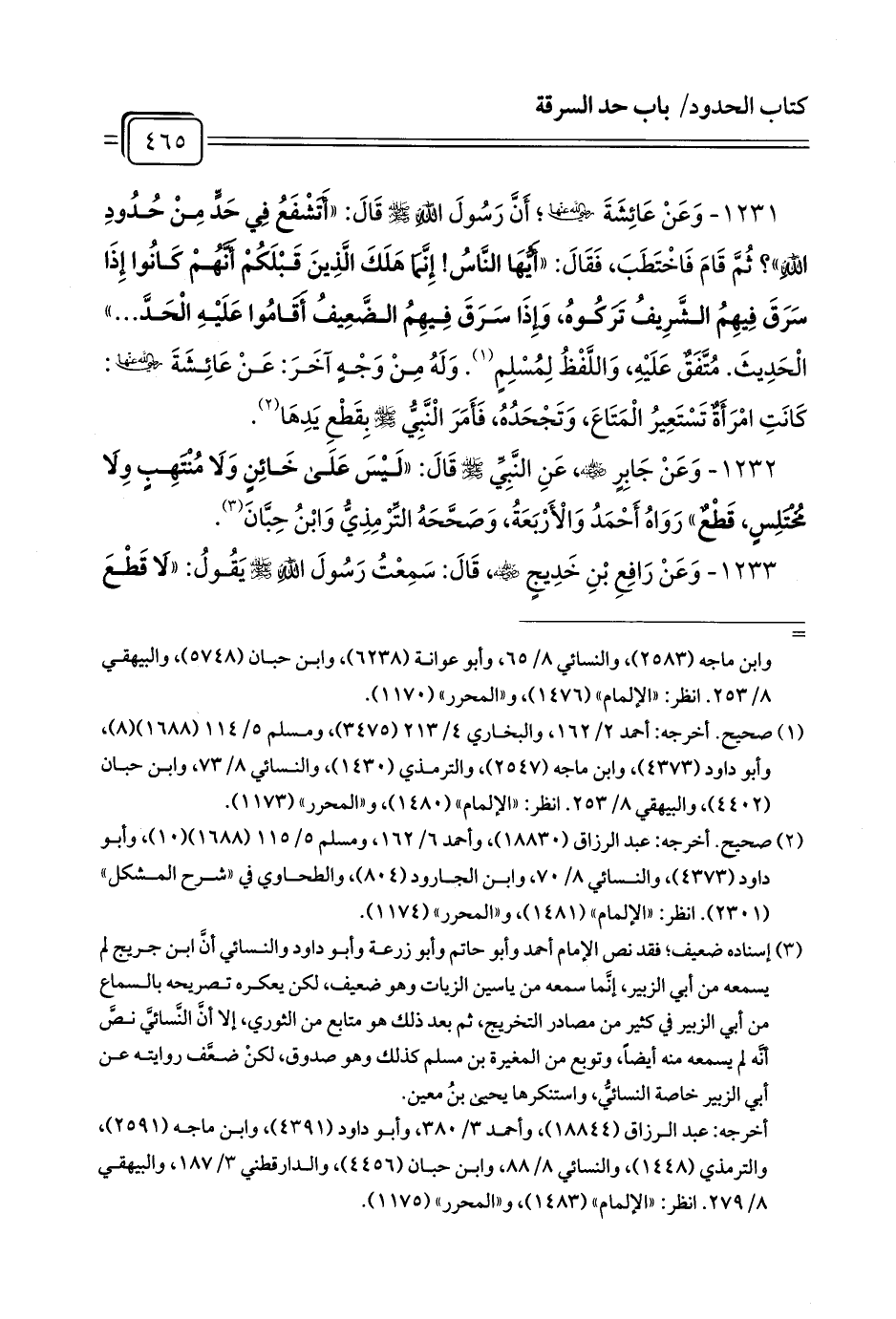 1231 - وَعَنْ عَائِشَةَ رَضِيَ اللَّهُ عَنْهَا؛ أَنَّ رَسُولَ اللَّهِ - صلى الله عليه وسلم - قَالَ: «أَتَشْفَعُ فِي حَدٍّ مِنْ حُدُودِ الْلَّهِ»؟ ثُمَّ قَامَ فَاخْتَطَبَ، فَقَالَ: «أَيُّهَا النَّاسُ! إِنَّمَا هَلَكَ الَّذِينَ قَبْلَكُمْ أَنَّهُمْ كَانُوا إِذَا سَرَقَ فِيهِمُ الشَّرِيفُ تَرَكُوهُ، وَإِذَا سَرَقَ فِيهِمُ الضَّعِيفُ أَقَامُوا عَلَيْهِ الْحَدَّ ...» الْحَدِيثَ. مُتَّفَقٌ عَلَيْهِ، وَاللَّفْظُ لِمُسْلِمٍ (¬1). وَلَهُ مِنْ وَجْهٍ آخَرَ: عَنْ عَائِشَةَ رَضِيَ اللهُ عَنْهَا: كَانَتِ امْرَأَةٌ تَسْتَعِيرُ الْمَتَاعَ، وَتَجْحَدُهُ، فَأَمَرَ الْنَّبِيُّ - صلى الله عليه وسلم - بِقَطْعِ يَدِهَا (¬2).