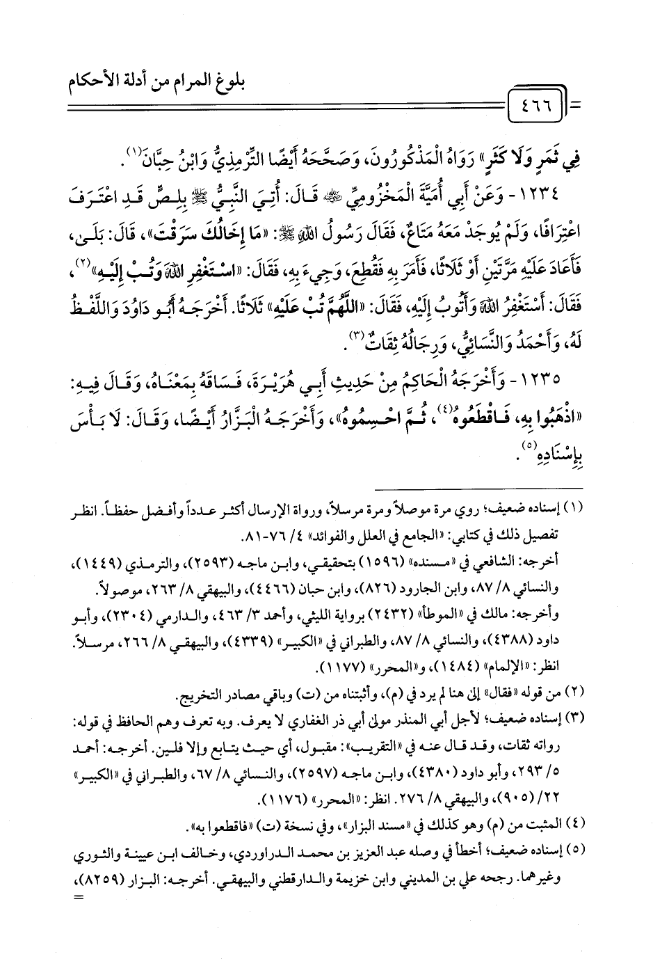 1234 - وَعَنْ أَبِي أُمَيَّةَ الْمَخْزُومِيِّ - رضي الله عنه - قَالَ: أُتِيَ النَّبِيُّ - صلى الله عليه وسلم - بِلِصٍّ قَدِ اعْتَرَفَ اعْتِرَافًا، وَلَمْ يُوجَدْ مَعَهُ مَتَاعٌ، فَقَالَ رَسُولُ اللَّهِ - صلى الله عليه وسلم -: «مَا إِخَالُكَ سَرَقْتَ»، قَالَ: بَلَى، فَأَعَادَ عَلَيْهِ مَرَّتَيْنِ أَوْ ثَلَاثًا، فَأَمَرَ بِهِ فَقُطِعَ، وَجِيءَ بِهِ، فَقَالَ: «اسْتَغْفِرِ اللَّهَ وَتُبْ إِلَيْهِ» (¬1)، فَقَالَ: أَسْتَغْفِرُ اللَّهَ وَأَتُوبُ إِلَيْهِ، فَقَالَ: «اللَّهُمَّ تُبْ عَلَيْهِ» ثَلَاثًا. أَخْرَجَهُ أَبُو دَاوُدَ وَاللَّفْظُ لَهُ، وَأَحْمَدُ وَالنَّسَائِيُّ، وَرِجَالُهُ ثِقَاتٌ (¬2).