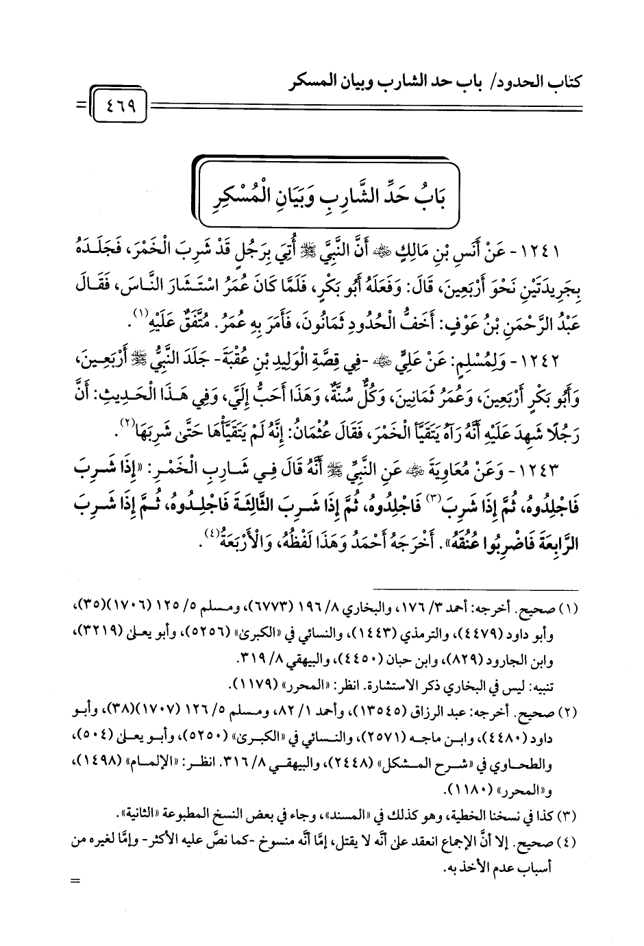 1241 - عَنْ أَنَسِ بْنِ مَالِكٍ - رضي الله عنه - أَنَّ النَّبِيَّ - صلى الله عليه وسلم - أُتِيَ بِرَجُلٍ قَدْ شَرِبَ الْخَمْرَ، فَجَلَدَهُ بِجَرِيدَتَيْنِ نَحْوَ أَرْبَعِينَ، قَالَ: وَفَعَلَهُ أَبُو بَكْرٍ، فَلَمَّا كَانَ عُمَرُ اسْتَشَارَ النَّاسَ، فَقَالَ عَبْدُ الرَّحْمَنِ بْنُ عَوْفٍ: أَخَفُّ الْحُدُودِ ثَمَانُونَ، فَأَمَرَ بِهِ عُمَرُ. مُتَّفَقٌ عَلَيْهِ (¬1).