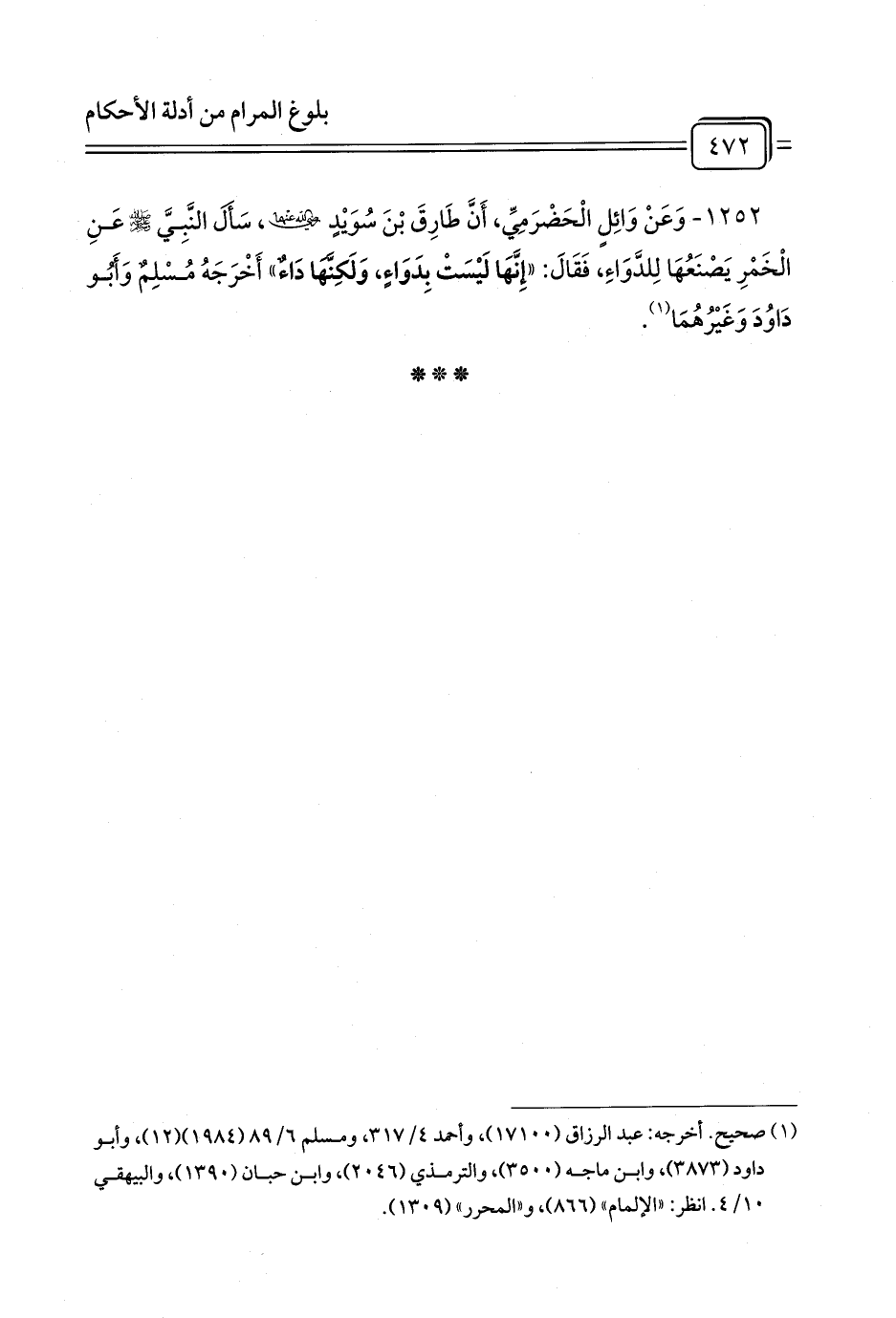 1252 - وَعَنْ وَائِلٍ الْحَضْرَمِيِّ، أَنَّ طَارِقَ بْنَ سُوَيْدٍ رَضِيَ اللَّهُ عَنْهُمَا، سَأَلَ النَّبِيَّ - صلى الله عليه وسلم - عَنِ الْخَمْرِ يَصْنَعُهَا لِلدَّوَاءِ، فَقَالَ: «إِنَّهَا لَيْسَتْ بِدَوَاءٍ، وَلَكِنَّهَا دَاءٌ» أَخْرَجَهُ مُسْلِمٌ وَأَبُو دَاوُدَ وَغَيْرُهُمَا (¬1).
