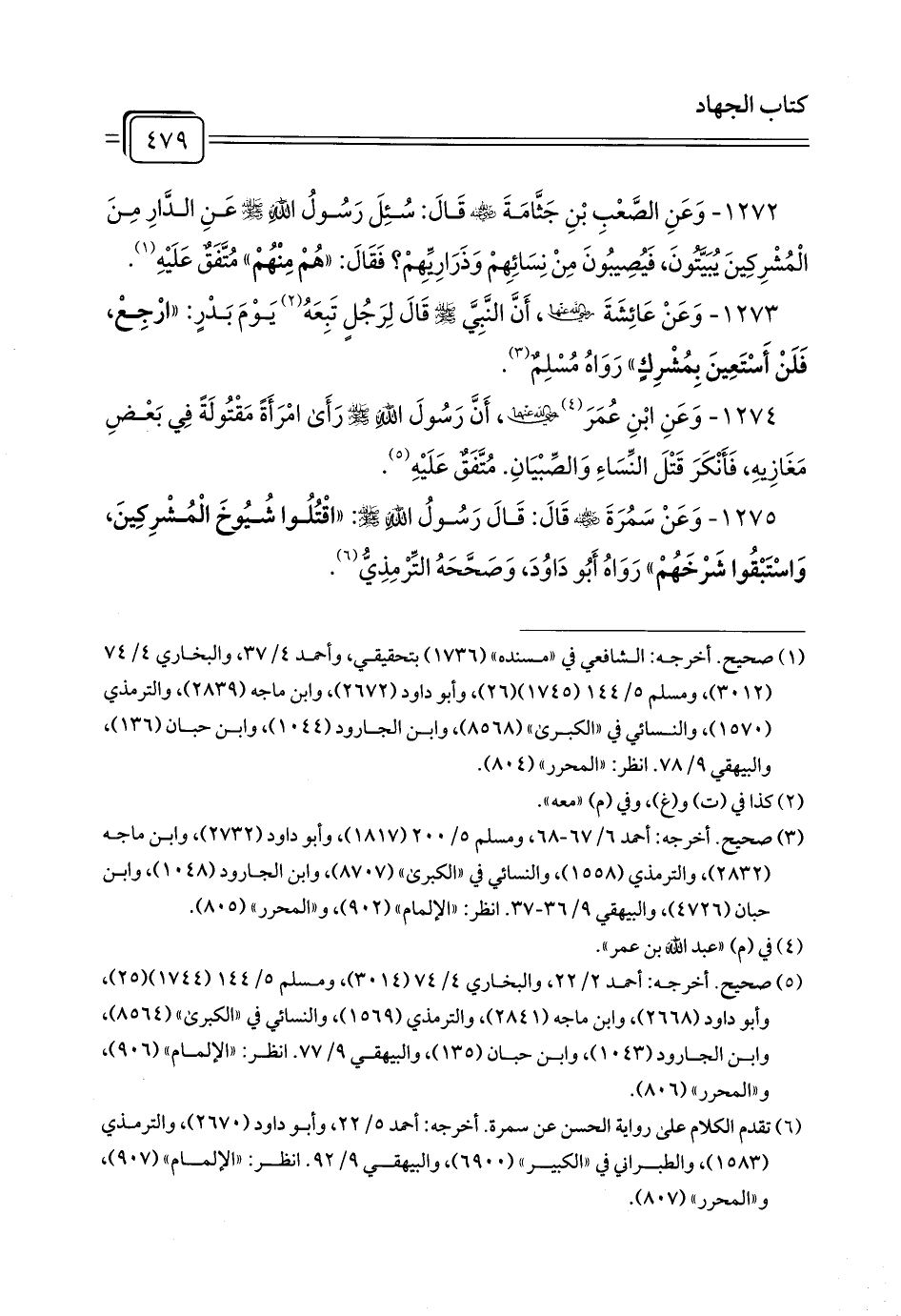 1274 - وَعَنِ ابْنِ عُمَرَ (¬1) رَضِيَ اللَّهُ عَنْهُمَا، أَنَّ رَسُولَ اللَّهِ - صلى الله عليه وسلم - رَأَى امْرَأَةً مَقْتُولَةً فِي بَعْضِ مَغَازِيهِ، فَأَنْكَرَ قَتْلَ النِّسَاءِ وَالصِّبْيَانِ. مُتَّفَقٌ عَلَيْهِ (¬2).