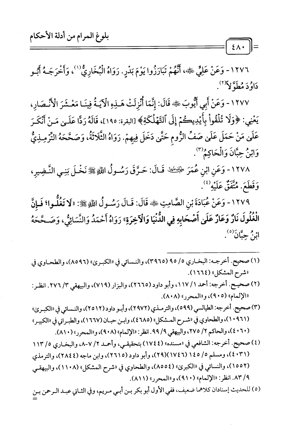 1277 - وَعَنْ أَبِي أَيُّوبَ - رضي الله عنه - قَالَ: إِنَّمَا أُنْزِلَتْ هَذِهِ الْآيَةُ فِينَا مَعْشَرَ الْأَنْصَارِ، يَعْنِي: {وَلَا تُلْقُوا بِأَيْدِيكُمْ إِلَى التَّهْلُكَةِ} [البقرة: 195]، قَالَهُ رَدًّا عَلَى مَنْ أَنْكَرَ عَلَى مَنْ حَمَلَ عَلَى صَفِّ الرُّومِ حَتَّى دَخَلَ فِيهِمْ. رَوَاهُ الثَّلَاثَةُ، وَصَحَّحَهُ التِّرْمِذِيُّ وَابْنُ حِبَّانَ وَالْحَاكِمُ (¬1).
