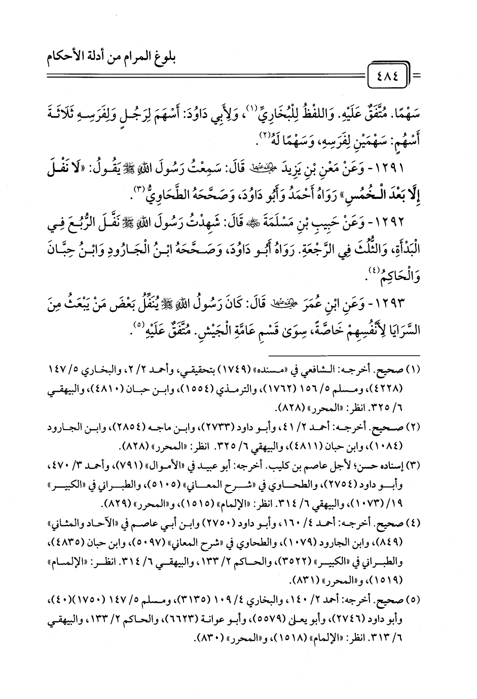 1291 - وَعَنْ مَعْنِ بْنِ يَزِيدَ رَضِيَ اللَّهُ عَنْهُمَا قَالَ: سَمِعْتُ رَسُولَ اللَّهِ - صلى الله عليه وسلم - يَقُولُ: «لَا نَفْلَ إِلَّا بَعْدَ الْخُمُسِ» رَوَاهُ أَحْمَدُ وَأَبُو دَاوُدَ، وَصَحَّحَهُ الطَّحَاوِيُّ (¬1).