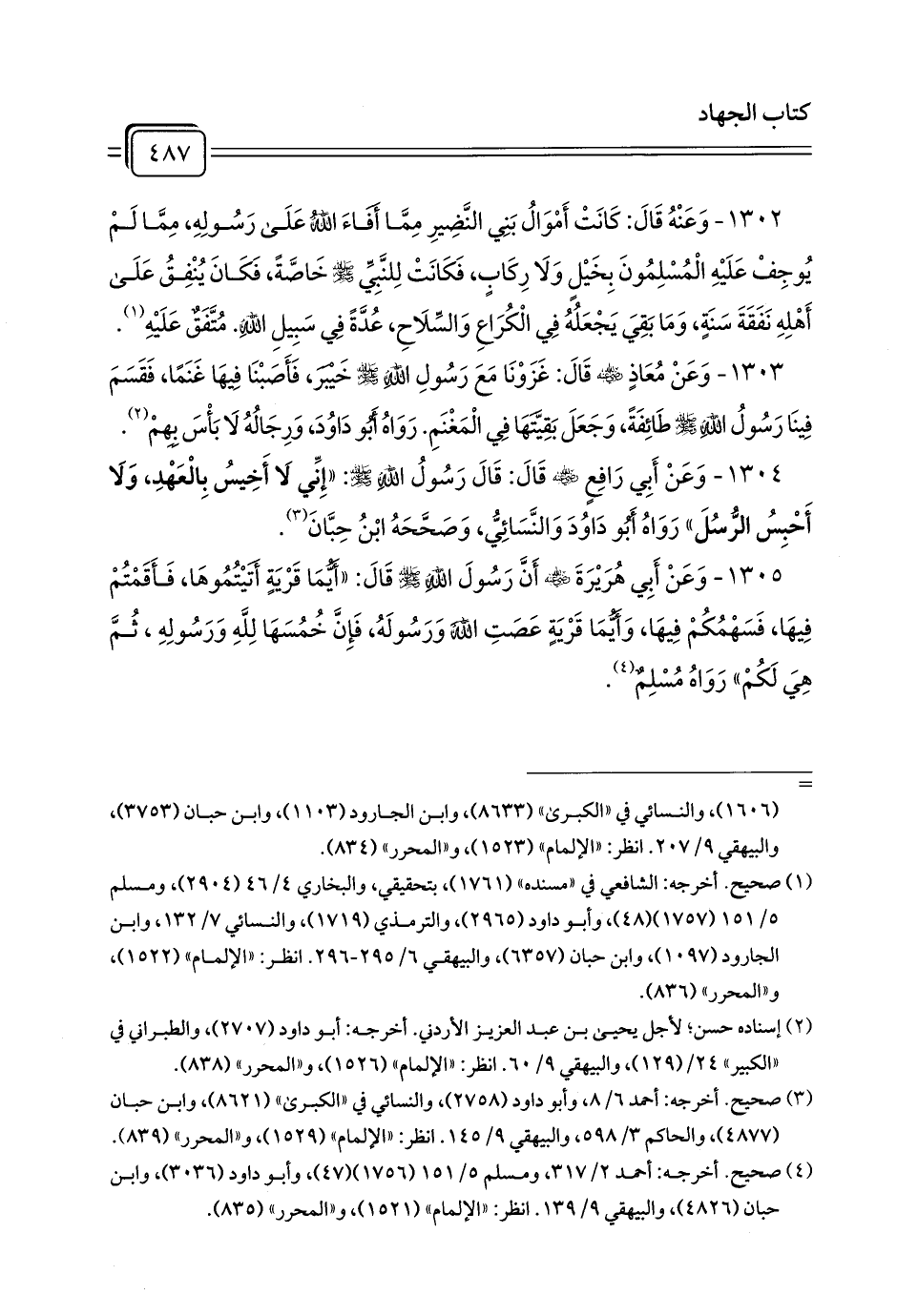 1303 - وَعَنْ مُعَاذٍ - رضي الله عنه - قَالَ: غَزَوْنَا مَعَ رَسُولِ اللَّهِ - صلى الله عليه وسلم - خَيْبَرَ، فَأَصَبْنَا فِيهَا غَنَمًا، فَقَسَمَ فِينَا رَسُولُ اللَّهِ - صلى الله عليه وسلم - طَائِفَةً، وَجَعَلَ بَقِيَّتَهَا فِي الْمَغْنَمِ. رَوَاهُ أَبُو دَاوُدَ، وَرِجَالُهُ لَا بَأْسَ بِهِمْ (¬1).