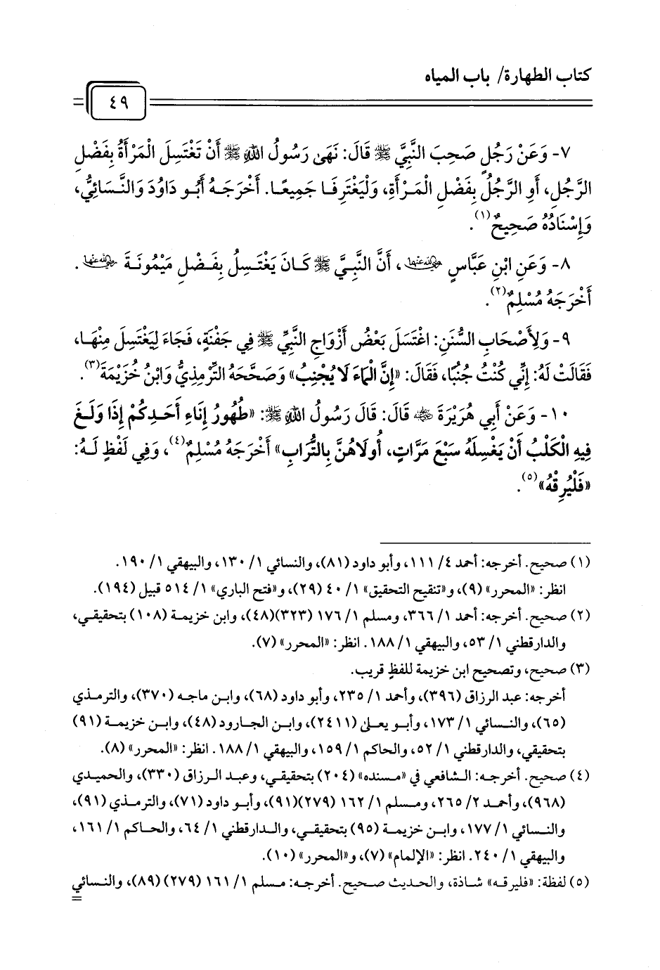 7 - وَعَنْ رَجُلٍ صَحِبَ النَّبِيَّ - صلى الله عليه وسلم - قَالَ: نَهَى رَسُولُ اللَّهِ - صلى الله عليه وسلم - أَنْ تَغْتَسِلَ الْمَرْأَةُ بِفَضْلِ الرَّجُلِ، أَوِ الرَّجُلُ بِفَضْلِ الْمَرْأَةِ، وَلْيَغْتَرِفَا جَمِيعًا. أَخْرَجَهُ أَبُو دَاوُدَ وَالنَّسَائِيُّ، وَإِسْنَادُهُ صَحِيحٌ (¬1).