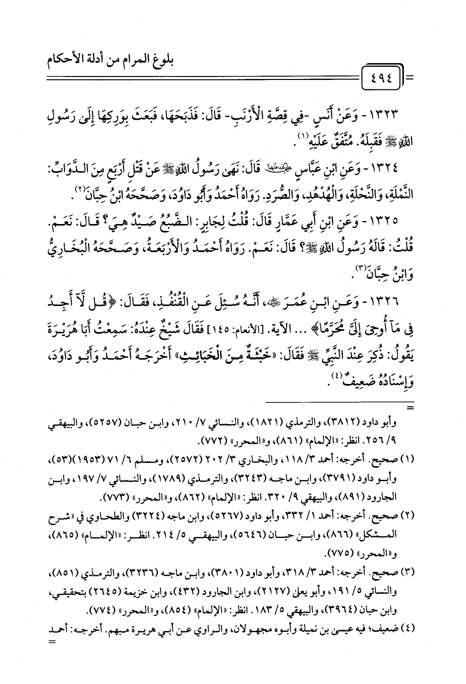 1324 - وَعَنِ ابْنِ عَبَّاسٍ رَضِيَ اللَّهُ عَنْهُمَا قَالَ: نَهَى رَسُولُ اللَّهِ - صلى الله عليه وسلم - عَنْ قَتْلِ أَرْبَعٍ مِنَ الدَّوَابِّ: النَّمْلَةِ، وَالنَّحْلَةِ، وَالْهُدْهُدِ، وَالصُّرَدِ. رَوَاهُ أَحْمَدُ وَأَبُو دَاوُدَ، وَصَحَّحَهُ ابْنُ حِبَّانَ (¬1).