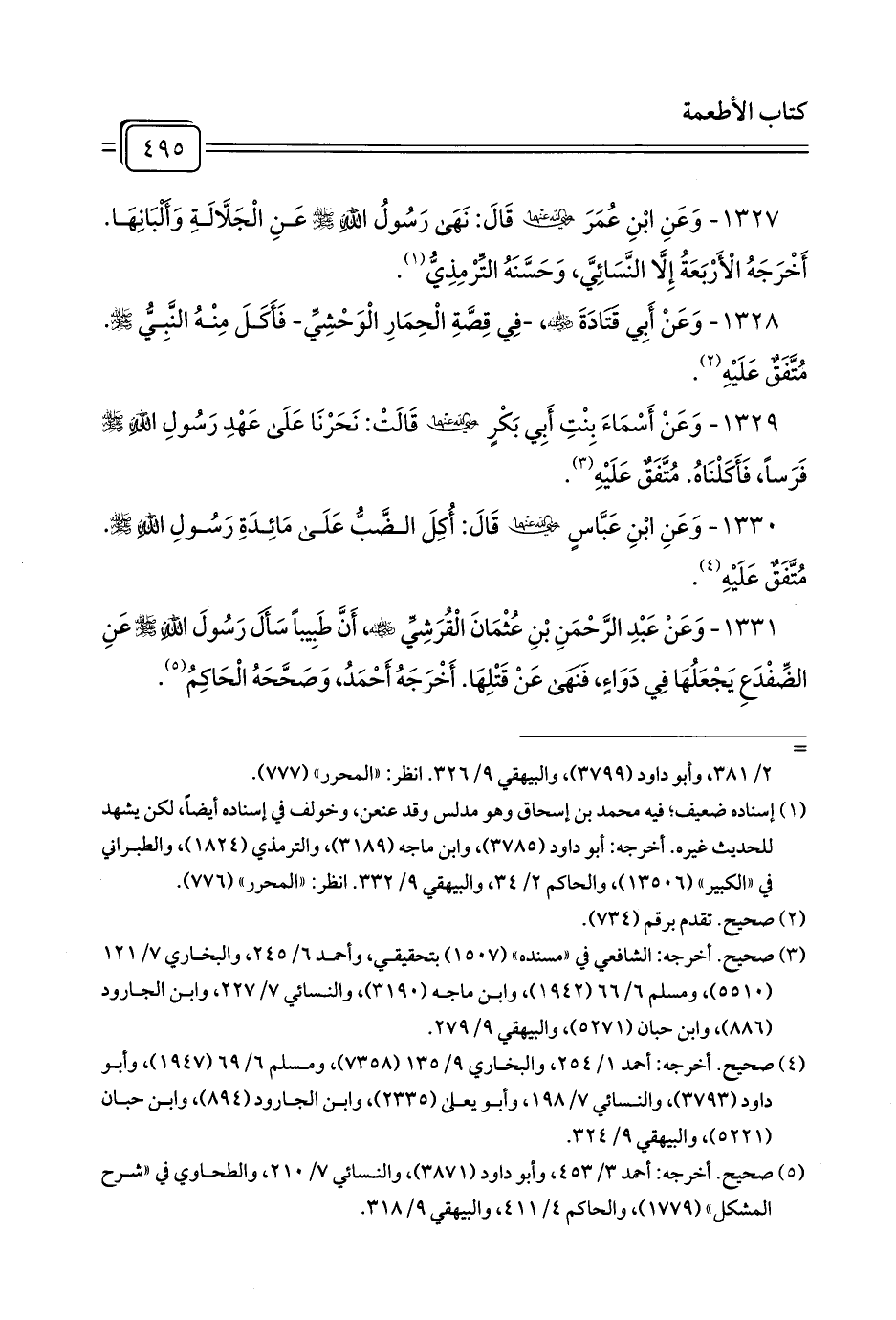 1328 - وَعَنْ أَبِي قَتَادَةَ - رضي الله عنه -، -فِي قِصَّةِ الْحِمَارِ الْوَحْشِيِّ- فَأَكَلَ مِنْهُ النَّبِيُّ - صلى الله عليه وسلم -. مُتَّفَقٌ عَلَيْهِ (¬1).