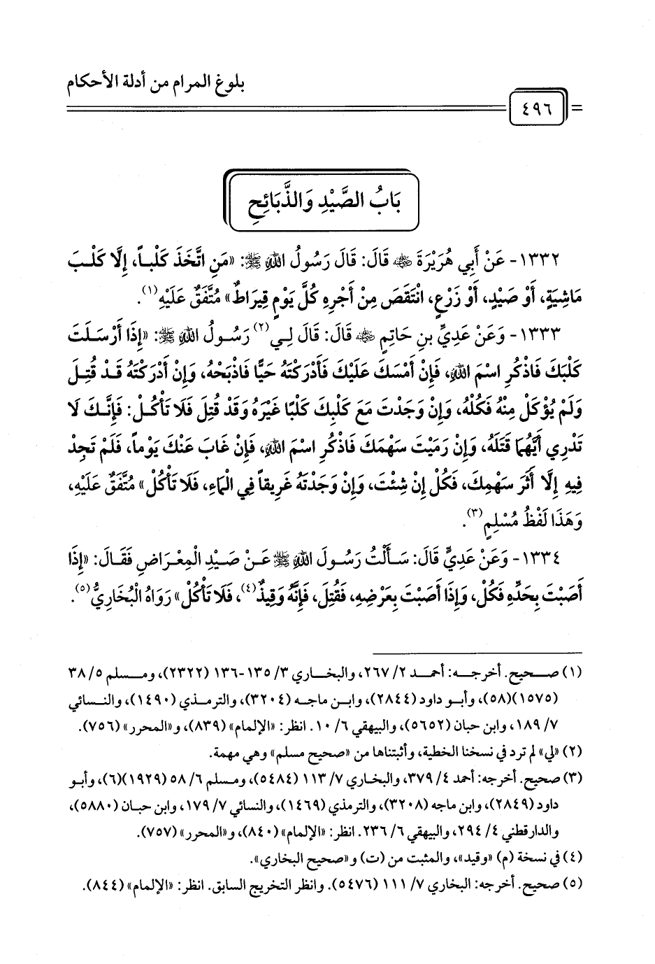 1333 - وَعَنْ عَدِيِّ بنِ حَاتِمٍ - رضي الله عنه - قَالَ: قَالَ لِي (¬1) رَسُولُ اللَّهِ - صلى الله عليه وسلم -: «إِذَا أَرْسَلَتَ كَلْبَكَ فَاذْكُرِ اسْمَ اللَّهِ، فَإِنْ أَمْسَكَ عَلَيْكَ فَأَدْرَكْتَهُ حَيًّا فَاذْبَحْهُ، وَإِنْ أَدْرَكْتَهُ قَدْ قُتِلَ وَلَمْ يُؤْكَلْ مِنْهُ فَكُلْهُ، وَإِنْ وَجَدْتَ مَعَ كَلْبِكَ كَلْبًا غَيْرَهُ وَقَدْ قُتِلَ فَلَا تَأْكُلْ: فَإِنَّكَ لَا تَدْرِي أَيَّهُمَا قَتَلَهُ، وَإِنْ رَمَيْتَ سَهْمَكَ فَاذْكُرِ اسْمَ اللَّهِ، فَإِنْ غَابَ عَنْكَ يَوْماً، فَلَمْ تَجِدْ فِيهِ إِلَّا أَثَرَ سَهْمِكَ، فَكُلْ إِنْ شِئْتَ، وَإِنْ وَجَدْتَهُ غَرِيقاً فِي الْمَاءِ، فَلَا تَأْكُلْ» مُتَّفَقٌ عَلَيْهِ، وَهَذَا لَفْظُ مُسْلِمٍ (¬2).