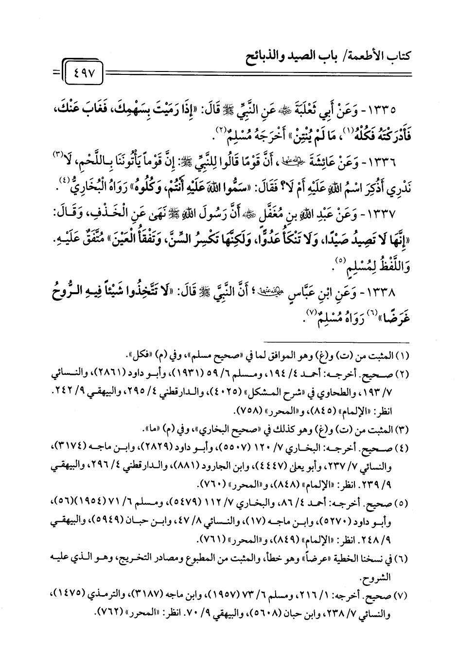 1338 - وَعَنِ ابْنِ عَبَّاسٍ رَضِيَ اللَّهُ عَنْهُمَا; أَنَّ النَّبِيَّ - صلى الله عليه وسلم - قَالَ: «لَا تَتَّخِذُوا شَيْئاً فِيهِ الرُّوحُ غَرَضًا» (¬1) رَوَاهُ مُسْلِمٌ (¬2).