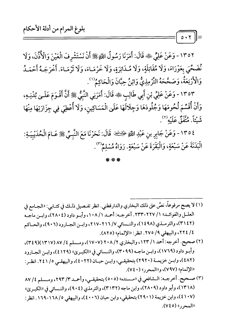 1352 - وَعَنْ عَلِيٍّ - رضي الله عنه - قَالَ: أَمَرَنَا رَسُولُ اللَّهِ - صلى الله عليه وسلم - أَنْ نَسْتَشْرِفَ الْعَيْنَ وَالْأُذُنَ، وَلَا نُضَحِّيَ بِعَوْرَاءَ، وَلَا مُقَابَلَةٍ، وَلَا مُدَابَرَةٍ، وَلَا خَرْمَاءَ، وَلَا ثَرْمَاءَ. أَخْرَجَهُ أَحْمَدُ وَالْأَرْبَعَةُ، وَصَحَّحَهُ التِّرْمِذِيُّ وَابْنُ حِبَّانَ وَالْحَاكِمُ (¬1).