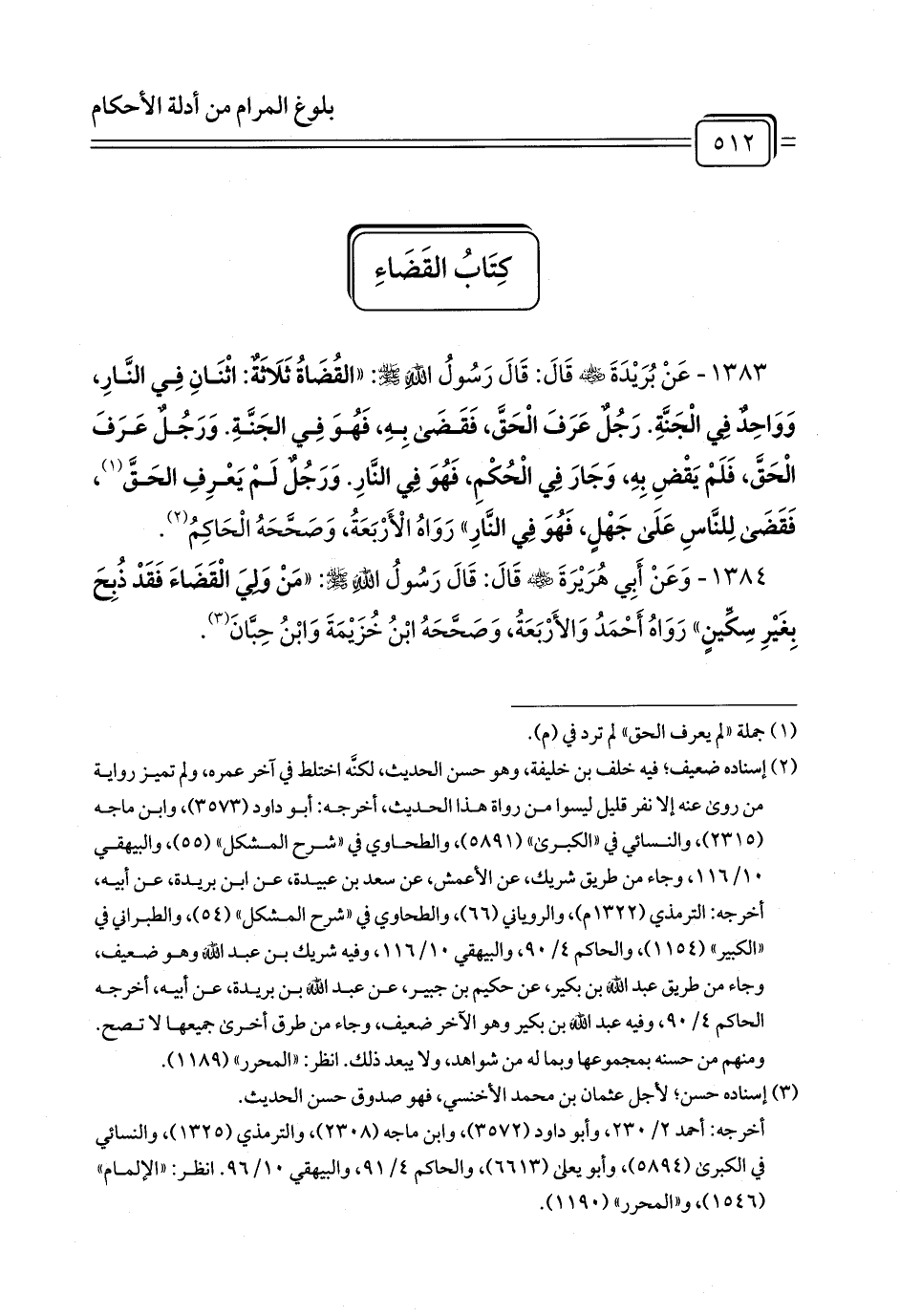 1383 - عَنْ بُرَيْدَةَ - رضي الله عنه - قَالَ: قَالَ رَسُولُ اللَّهِ - صلى الله عليه وسلم -: «القُضَاةُ ثَلَاثَةٌ: اثْنَانِ فِي النَّارِ، وَوَاحِدٌ فِي الْجَنَّةِ. رَجُلٌ عَرَفَ الْحَقَّ، فَقَضَى بِهِ، فَهُوَ فِي الجَنَّةِ. وَرَجُلٌ عَرَفَ الْحَقَّ، فَلَمْ يَقْضِ بِهِ، وَجَارَ فِي الْحُكْمِ، فَهُوَ فِي النَّارِ. وَرَجُلٌ لَمْ يَعْرِفِ الحَقَّ (¬1)، فَقَضَى لِلنَّاسِ عَلَى جَهْلٍ، فَهُوَ فِي النَّارِ» رَوَاهُ الْأَرْبَعَةُ، وَصَحَّحَهُ الْحَاكِمُ (¬2).