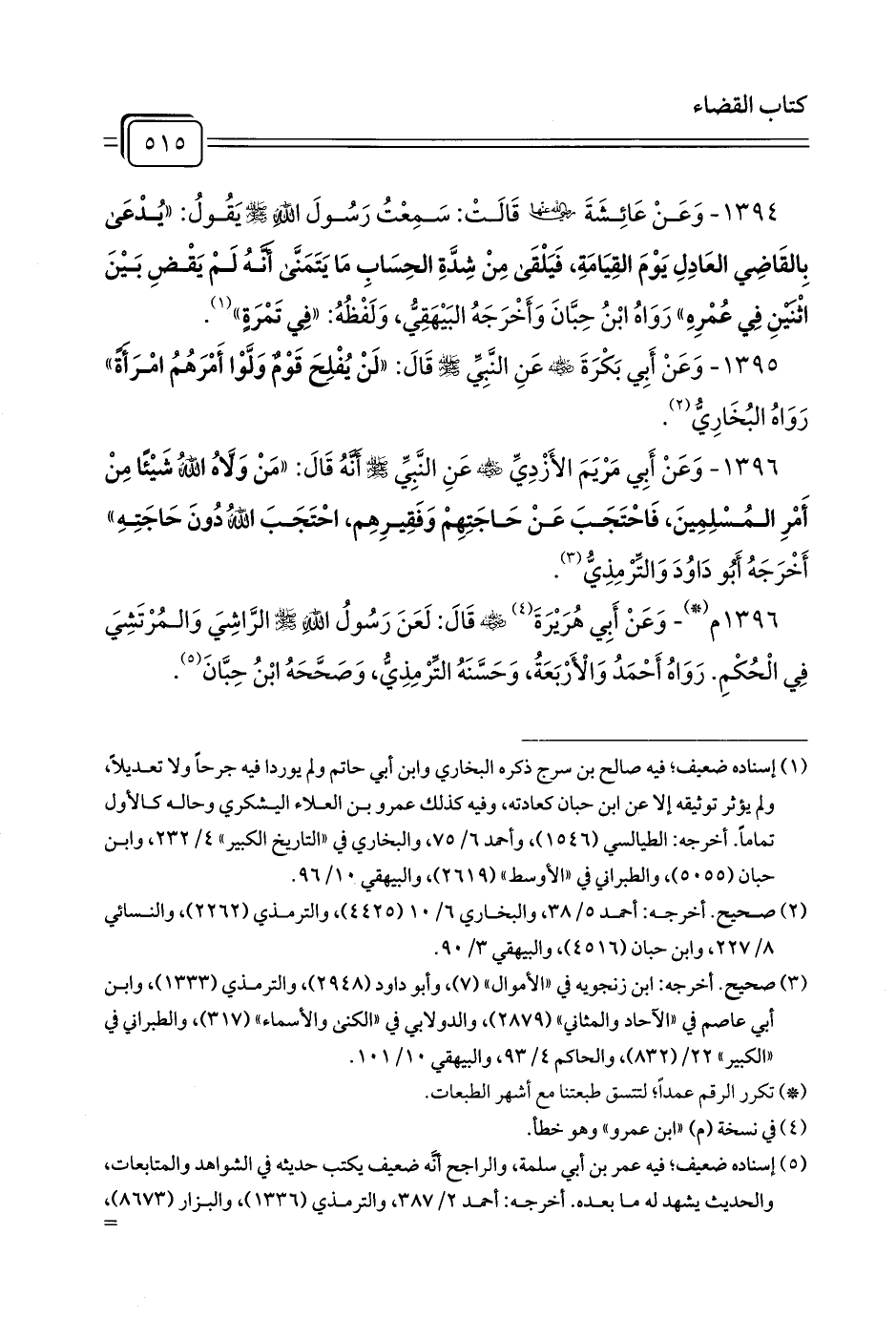 1396 - وَعَنْ أَبِي هُرَيْرَةَ (¬1) - رضي الله عنه - قَالَ: لَعَنَ رَسُولُ اللَّهِ - صلى الله عليه وسلم - الرَّاشِيَ وَالمُرْتَشِيَ فِي الْحُكْمِ. رَوَاهُ أَحْمَدُ وَالْأَرْبَعَةُ، وَحَسَّنَهُ التِّرْمِذِيُّ، وَصَحَّحَهُ ابْنُ حِبَّانَ (¬2).