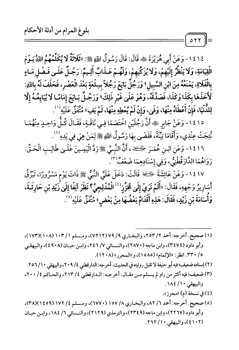 1414 - وَعَنْ أَبِي هُرَيْرَةَ - رضي الله عنه - قَالَ: قَالَ رَسُولُ اللَّهِ - صلى الله عليه وسلم -: «ثَلَاثَةٌ لَا يُكَلِّمُهُمُ اللَّهُ يَوْمَ الْقِيَامَةِ، وَلَا يَنْظُرُ إِلَيْهِمْ، وَلَا يُزَكِّيهِمْ، وَلَهُمْ عَذَابٌ أَلِيمٌ: رَجُلٌ عَلَى فَضْلِ مَاءٍ بِالْفَلَاةِ، يَمْنَعُهُ مِنَ ابْنِ السَّبِيلِ; وَرَجُلٌ بَايَعَ رَجُلاً بِسِلْعَةٍ بَعْدَ الْعَصْرِ، فَحَلَفَ لَهُ بِاللَّهِ: لَأَخَذَهَا بِكَذَا وَكَذَا، فَصَدَّقَهُ، وَهُوَ عَلَى غَيْرِ ذَلِكَ; وَرَجُلٌ بَايَعَ إِمَامًا لَا يُبَايِعُهُ إِلَّا لِلدُّنْيَا، فَإِنْ أَعْطَاهُ مِنْهَا، وَفَى، وَإِنْ لَمْ يُعْطِهِ مِنْهَا، لَمْ يَفِ» مُتَّفَقٌ عَلَيْهِ (¬1).