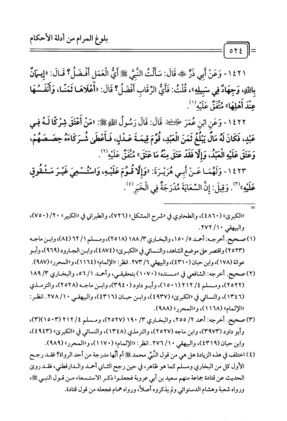 1421 - وَعَنْ أَبِي ذَرٍّ - رضي الله عنه - قَالَ: سَأَلْتُ النَّبِيَّ - صلى الله عليه وسلم - أَيُّ الْعَمَلِ أَفْضَلُ? قَالَ: «إِيمَانٌ بِاللَّهِ، وَجِهَادٌ فِي سَبِيلِهِ»، قُلْتُ: فَأَيُّ الرِّقَابِ أَفْضَلُ? قَالَ: «أَعْلَاهَا ثَمَنًا، وَأَنْفَسُهَا عِنْدَ أَهْلِهَا» مُتَّفَقٌ عَلَيْهِ (¬1).
