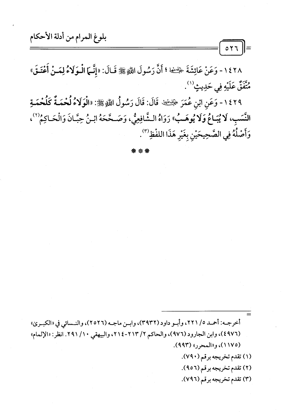 1428 - وَعَنْ عَائِشَةَ رَضِيَ اللَّهُ عَنْهَا; أَنَّ رَسُولَ اللَّهِ - صلى الله عليه وسلم - قَالَ: «إِنَّمَا الْوَلَاءُ لِمَنْ أَعْتَقَ» مُتَّفَقٌ عَلَيْهِ فِي حَدِيثٍ (¬1).