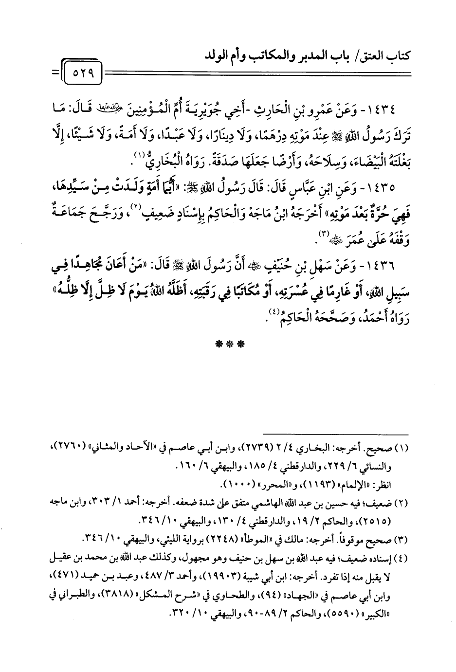 1435 - وَعَنِ ابْنِ عَبَّاسٍ قَالَ: قَالَ رَسُولُ اللَّهِ - صلى الله عليه وسلم -: «أَيُّمَا أَمَةٍ وَلَدَتْ مِنْ سَيِّدِهَا، فَهِيَ حُرَّةٌ بَعْدَ مَوْتِهِ» أَخْرَجَهُ ابْنُ مَاجَهْ وَالْحَاكِمُ بِإِسْنَادٍ ضَعِيفٍ (¬1)، وَرَجَّحَ جَمَاعَةٌ وَقْفَهُ عَلَى عُمَرَ - رضي الله عنه - (¬2).