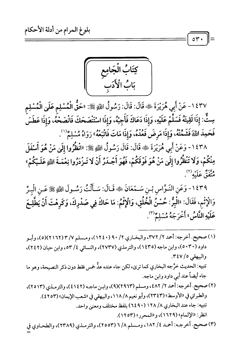 1439 - وَعَنِ النَوَّاسِ بْنِ سَمْعَانَ - رضي الله عنه - قَالَ: سَأَلْتُ رَسُولَ اللَّهِ - صلى الله عليه وسلم - عَنِ الْبِرِّ وَالْإِثْمِ، فَقَالَ: «الْبِرُّ: حُسْنُ الْخُلُقِ، وَالْإِثْمُ: مَا حَاكَ فِي صَدْرِكَ، وَكَرِهْتَ أَنْ يَطَّلِعَ عَلَيْهِ النَّاسُ» أَخْرَجَهُ مُسْلِمٌ (¬1).