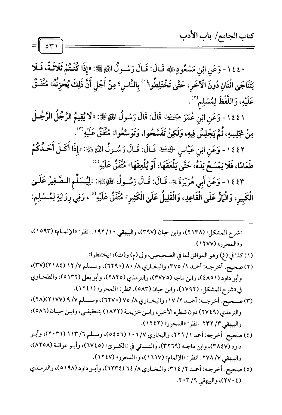 1440 - وَعَنِ ابْنِ مَسْعُودٍ - رضي الله عنه - قَالَ: قَالَ رَسُولُ اللَّهِ - صلى الله عليه وسلم -: «إِذَا كُنْتُمْ ثَلَاثَةً، فَلَا يَتَنَاجَى اثْنَانِ دُونَ الْآخَرِ، حَتَّى تَخْتَلِطُوا (¬1) بِالنَّاسِ; مِنْ أَجْلِ أَنَّ ذَلِكَ يُحْزِنُهُ» مُتَّفَقٌ عَلَيْهِ، وَاللَّفْظُ لِمُسْلِمٍ (¬2).
