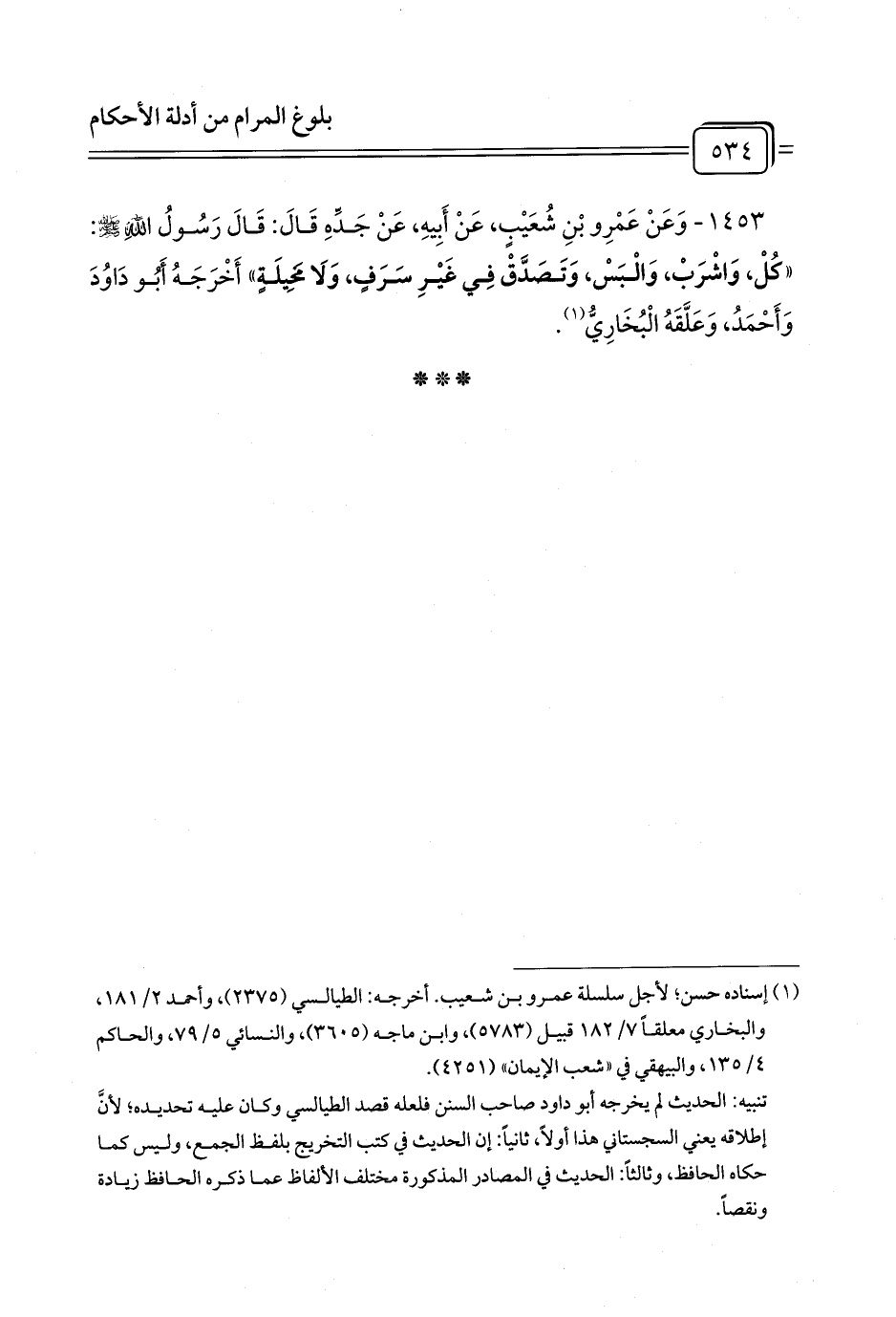 «كُلْ، وَاشْرَبْ، وَالْبَسْ، وَتَصَدَّقْ فِي غَيْرِ سَرَفٍ، وَلَا مَخِيلَةٍ» أَخْرَجَهُ أَبُو دَاوُدَ وَأَحْمَدُ، وَعَلَّقَهُ الْبُخَارِيُّ (¬1).