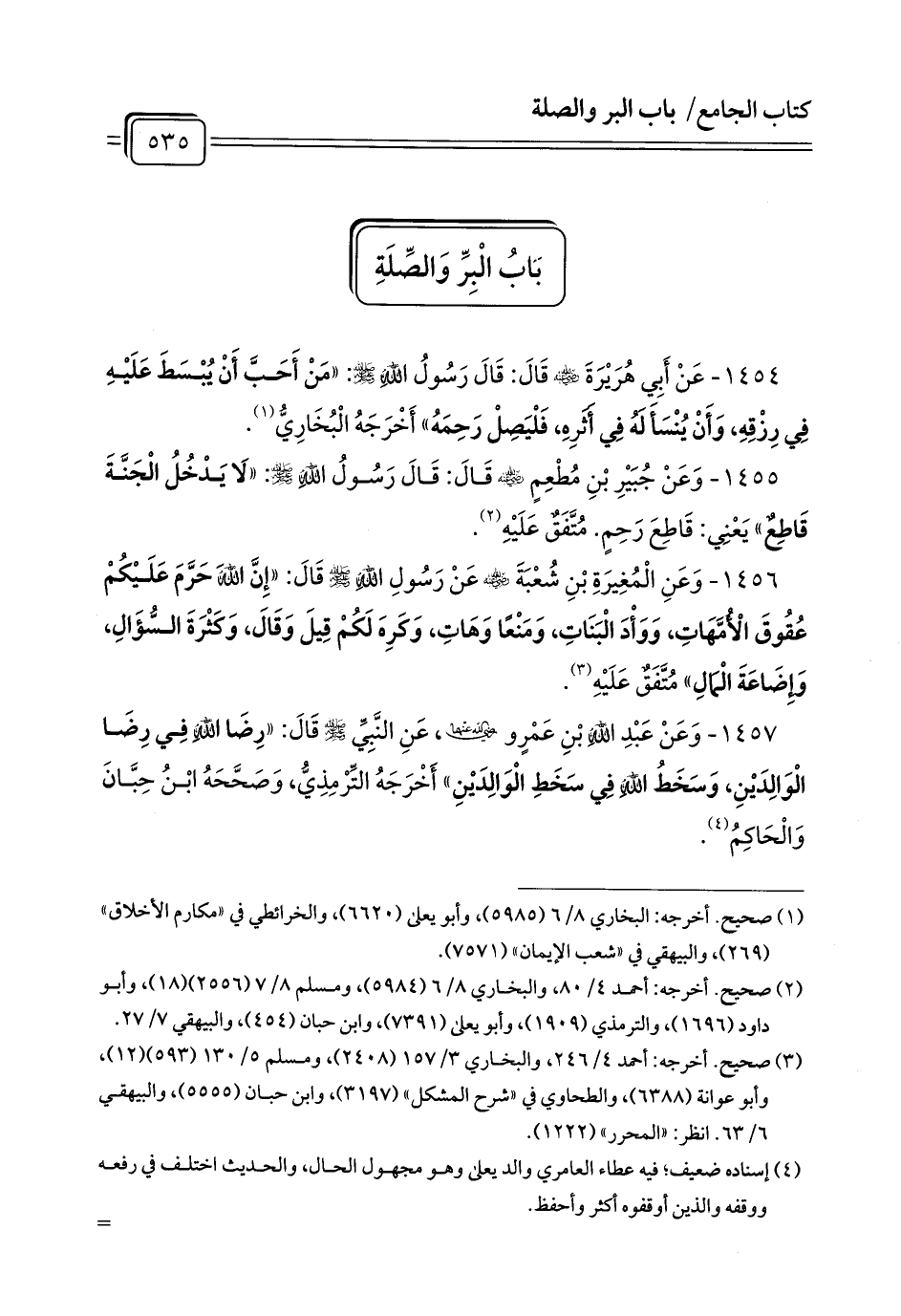 1454 - عَنْ أَبِي هُرَيْرَةَ - رضي الله عنه - قَالَ: قَالَ رَسُولُ اللَّهِ - صلى الله عليه وسلم -: «مَنْ أَحَبَّ أَنْ يُبْسَطَ عَلَيْهِ فِي رِزْقِهِ، وَأَنْ يُنْسَأَ لَهُ فِي أَثَرِهِ، فَلْيَصِلْ رَحِمَهُ» أَخْرَجَهُ الْبُخَارِيُّ (¬1).