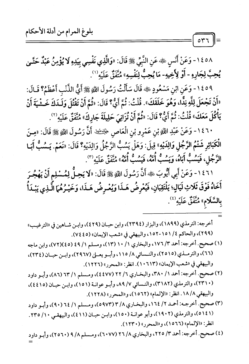 1458 - وَعَنْ أَنَسٍ - رضي الله عنه - عَنِ النَّبِيِّ - صلى الله عليه وسلم - قَالَ: «وَالَّذِي نَفْسِي بِيَدِهِ لَا يُؤْمِنُ عَبْدٌ حَتَّى يُحِبَّ لِجَارِهِ - أَوْ لِأَخِيهِ- مَا يُحِبُّ لِنَفْسِهِ» مُتَّفَقٌ عَلَيْهِ (¬1).
