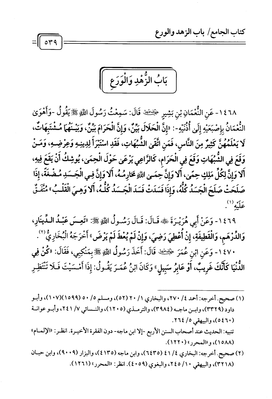 1468 - عَنِ النُّعْمَانِ بْنِ بَشِيرٍ رَضِيَ اللَّهُ عَنْهُمَا قَالَ: سَمِعْتُ رَسُولَ اللَّهِ - صلى الله عليه وسلم - يَقُولُ -وَأَهْوَى النُّعْمَانُ بِإِصْبَعَيْهِ إِلَى أُذُنَيْهِ-: «إِنَّ الْحَلَالَ بَيِّنٌ، وَإِنَّ الْحَرَامَ بَيِّنٌ، وَبَيْنَهُمَا مُشْتَبِهَاتٌ، لَا يَعْلَمُهُنَّ كَثِيرٌ مِنَ النَّاسِ، فَمَنِ اتَّقَى الشُّبُهَاتِ، فَقَدِ اسْتَبْرَأَ لِدِينِهِ وَعِرْضِهِ، وَمَنْ وَقَعَ فِي الشُّبُهَاتِ وَقَعَ فِي الْحَرَامِ، كَالرَّاعِي يَرْعَى حَوْلَ الْحِمَى، يُوشِكُ أَنْ يَقَعَ فِيهِ، أَلَا وَإِنَّ لِكُلِّ مَلِكٍ حِمًى، أَلَا وَإِنَّ حِمَى اللَّهِ مَحَارِمُهُ، أَلَا وَإِنَّ فِي الْجَسَدِ مُضْغَةً، إِذَا صَلَحَتْ صَلَحَ الْجَسَدُ كُلُّهُ، وَإِذَا فَسَدَتْ فَسَدَ الْجَسَدُ كُلُّهُ، أَلَا وَهِيَ الْقَلْبُ» مُتَّفَقٌ عَلَيْهِ (¬1).