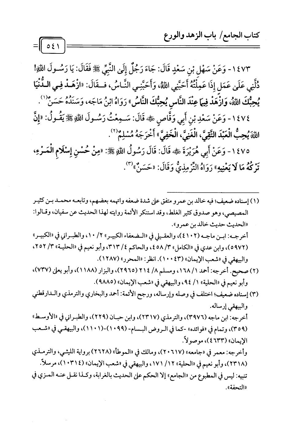 1475 - وَعَنْ أَبِي هُرَيْرَةَ - رضي الله عنه - قَالَ: قَالَ رَسُولُ اللَّهِ - صلى الله عليه وسلم -: «مِنْ حُسْنِ إِسْلَامِ الْمَرْءِ، تَرْكُهُ مَا لَا يَعْنِيهِ» رَوَاهُ التِّرْمِذِيُّ وَقَالَ: «حَسَنٌ» (¬1).