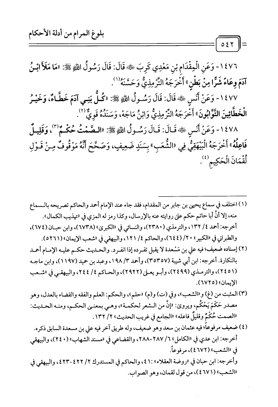 1478 - وَعَنْ أَنَسٍ - رضي الله عنه - قَالَ: قَالَ رَسُولُ اللَّهِ - صلى الله عليه وسلم -: «الصَّمْتُ حُكْمٌ (¬1)، وَقَلِيلٌ فَاعِلُهُ» أَخْرَجَهُ الْبَيْهَقِيُّ فِي «الشُّعَبِ» بِسَنَدٍ ضَعِيفٍ، وَصَحَّحَ أَنَّهُ مَوْقُوفٌ مِنْ قَوْلِ لُقْمَانَ الْحَكِيمِ (¬2).