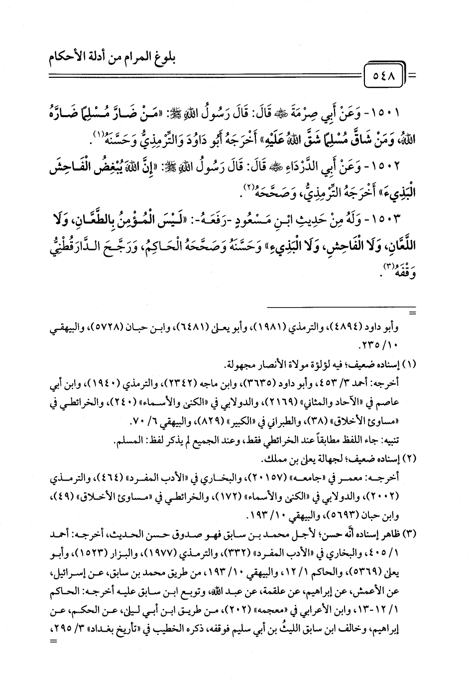 1503 - وَلَهُ مِنْ حَدِيثِ ابْنِ مَسْعُودٍ -رَفَعَهُ-: «لَيْسَ الْمُؤْمِنُ بِالطَّعَّانِ، وَلَا اللَّعَّانِ، وَلَا الْفَاحِشِ، وَلَا الْبَذِيءِ» وَحَسَّنَهُ وَصَحَّحَهُ الْحَاكِمُ، وَرَجَّحَ الدَّارَقُطْنِيُّ وَقْفَهُ (¬1).