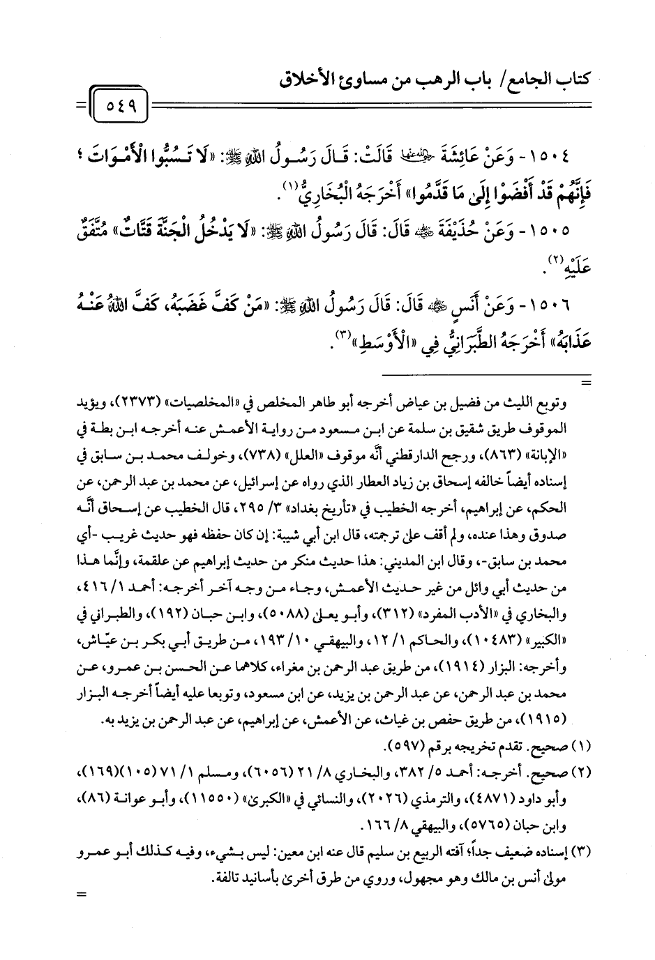 1504 - وَعَنْ عَائِشَةَ رَضِيَ اللَّهُ عَنْهَا قَالَتْ: قَالَ رَسُولُ اللَّهِ - صلى الله عليه وسلم -: «لَا تَسُبُّوا الْأَمْوَاتَ ; فَإِنَّهُمْ قَدْ أَفْضَوْا إِلَى مَا قَدَّمُوا» أَخْرَجَهُ الْبُخَارِيُّ (¬1).