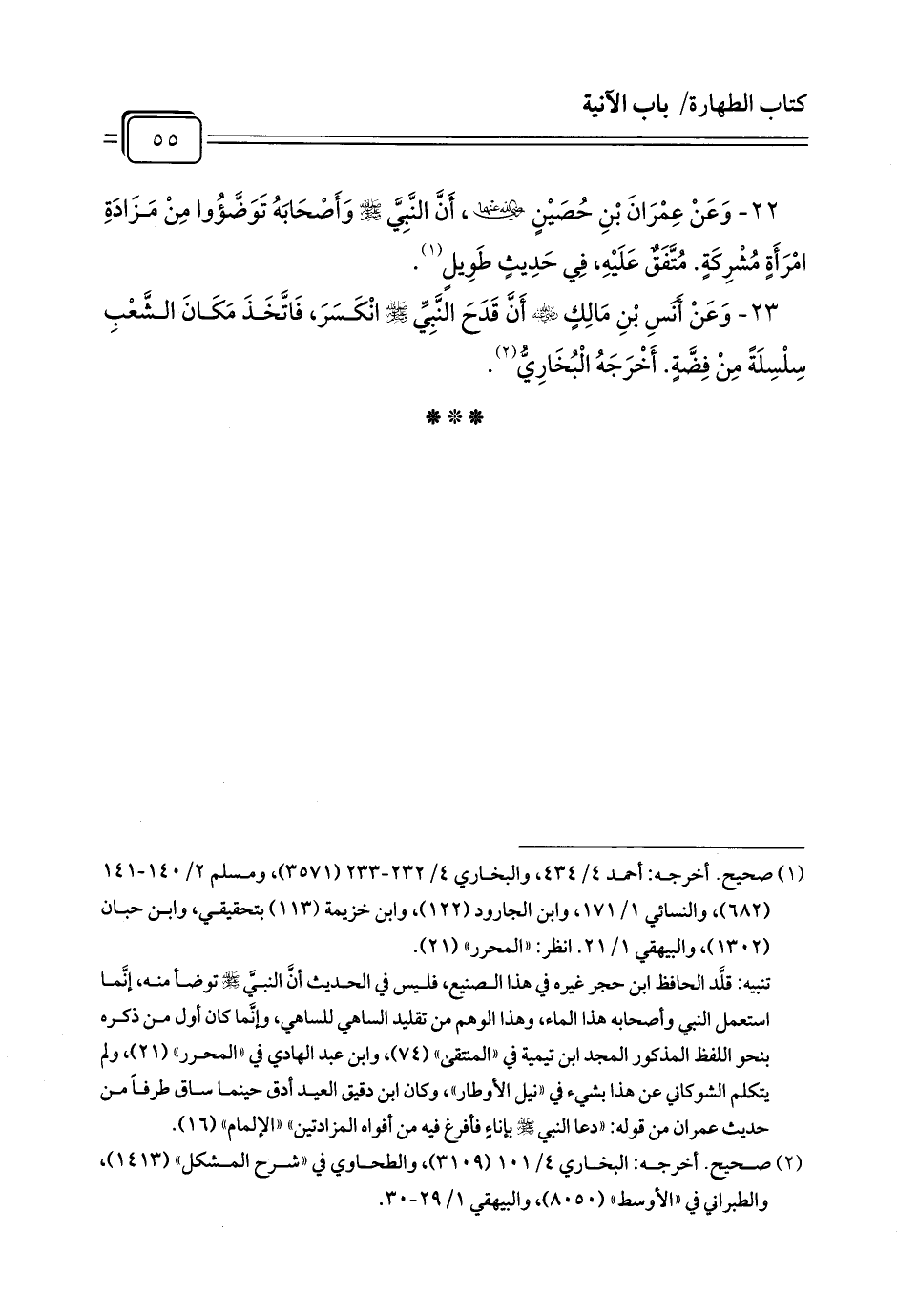 22 - وَعَنْ عِمْرَانَ بْنِ حُصَيْنٍ رَضِيَ الْلَّهُ عَنْهُمَا، أَنَّ النَّبِيَّ - صلى الله عليه وسلم - وَأَصْحَابَهُ تَوَضَّؤُوا مِنْ مَزَادَةِ امْرَأَةٍ مُشْرِكَةٍ. مُتَّفَقٌ عَلَيْهِ، فِي حَدِيثٍ طَوِيلٍ (¬1).