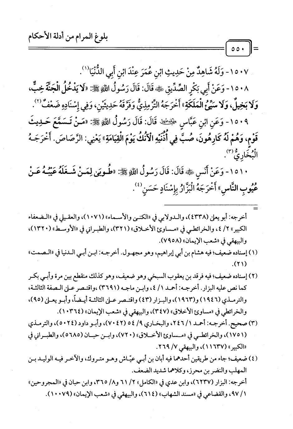 1508 - وَعَنْ أَبِي بَكْرٍ الصِّدِّيقِ - رضي الله عنه - قَالَ: قَالَ رَسُولُ اللَّهِ - صلى الله عليه وسلم -: «لَا يَدْخُلُ الْجَنَّةَ خِبٌّ، وَلَا بَخِيلٌ، وَلَا سَيِّئُ الْمَلَكَةِ» أَخْرَجَهُ التِّرْمِذِيُّ وَفَرَّقَهُ حَدِيثَيْنِ، وَفِي إِسْنَادِهِ ضَعْفٌ (¬1).
