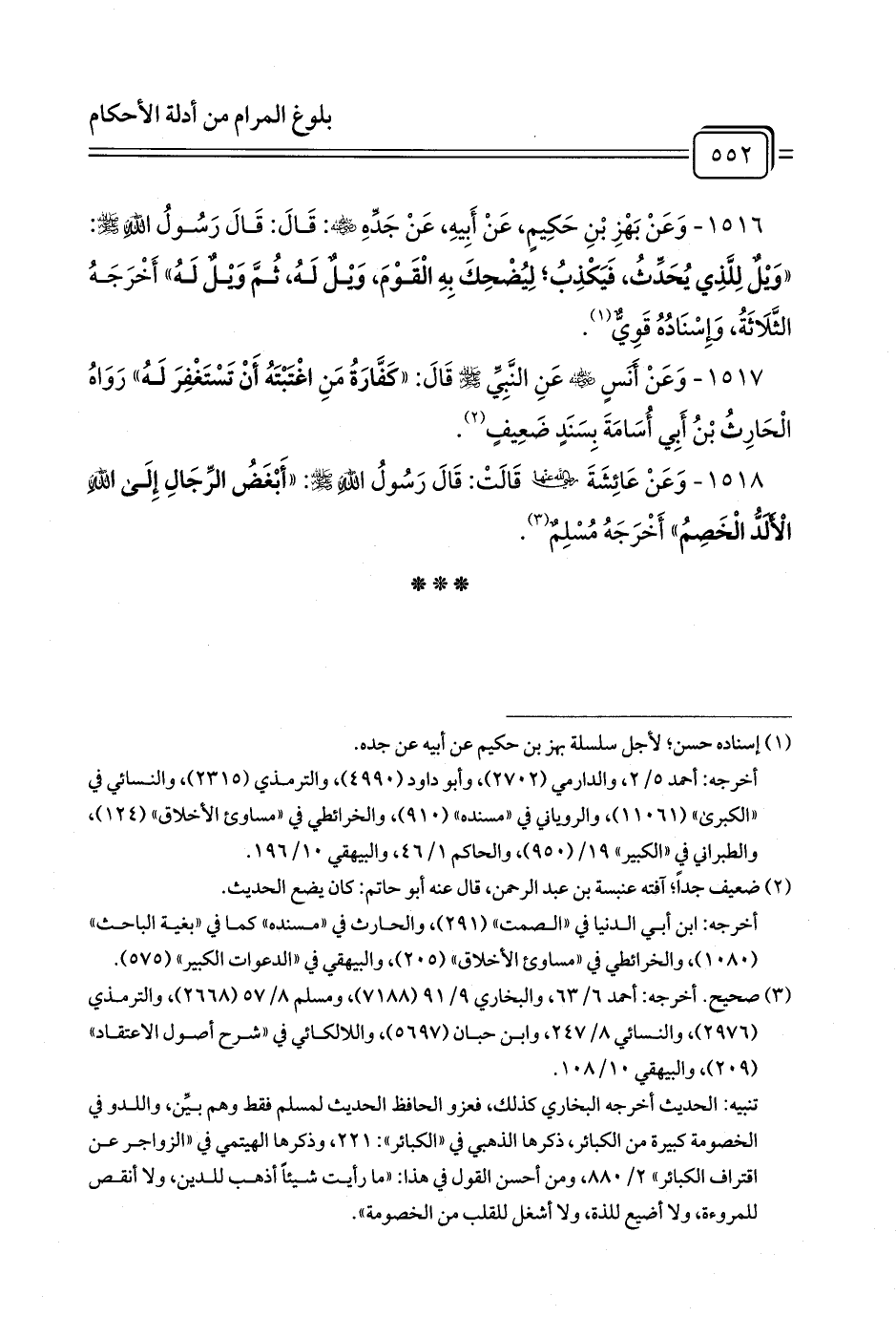 1516 - وَعَنْ بَهْزِ بْنِ حَكِيمٍ، عَنْ أَبِيهِ، عَنْ جَدِّهِ - رضي الله عنه -: قَالَ: قَالَ رَسُولُ اللَّهِ - صلى الله عليه وسلم -: «وَيْلٌ لِلَّذِي يُحَدِّثُ، فَيَكْذِبُ; لِيُضْحِكَ بِهِ الْقَوْمَ، وَيْلٌ لَهُ، ثُمَّ وَيْلٌ لَهُ» أَخْرَجَهُ الثَّلَاثَةُ، وَإِسْنَادُهُ قَوِيٌّ (¬1).