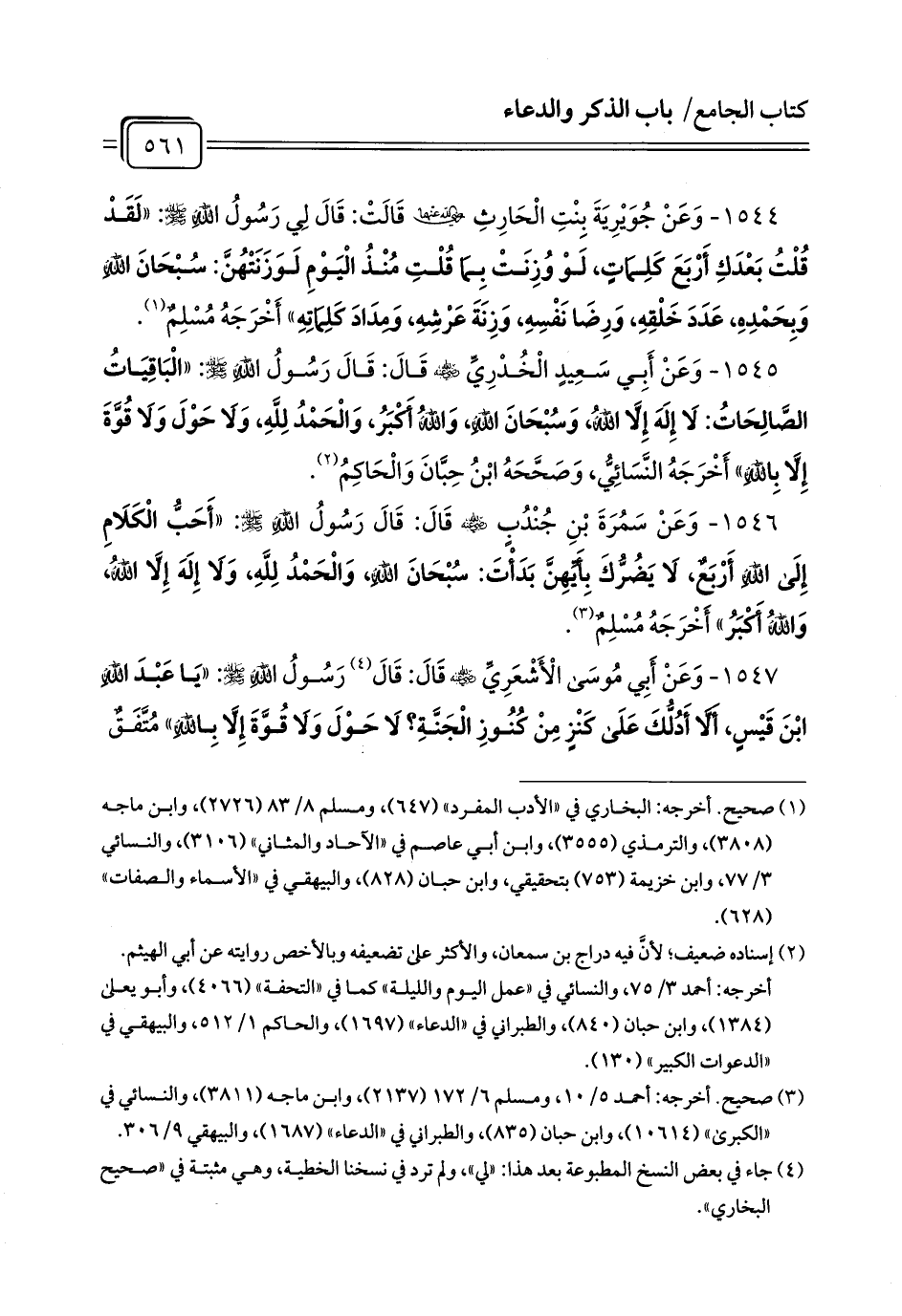 1544 - وَعَنْ جُوَيْرِيَةَ بِنْتِ الْحَارِثِ رَضِيَ اللهُ عَنْهُمَا قَالَتْ: قَالَ لِي رَسُولُ اللَّهِ - صلى الله عليه وسلم -: «لَقَدْ قُلْتُ بَعْدَكِ أَرْبَعَ كَلِمَاتٍ، لَوْ وُزِنَتْ بِمَا قُلْتِ مُنْذُ الْيَوْمِ لَوَزَنَتْهُنَّ: سُبْحَانَ اللَّهِ وَبِحَمْدِهِ، عَدَدَ خَلْقِهِ، وَرِضَا نَفْسِهِ، وَزِنَةَ عَرْشِهِ، وَمِدَادَ كَلِمَاتِهِ» أَخْرَجَهُ مُسْلِمٌ (¬1).