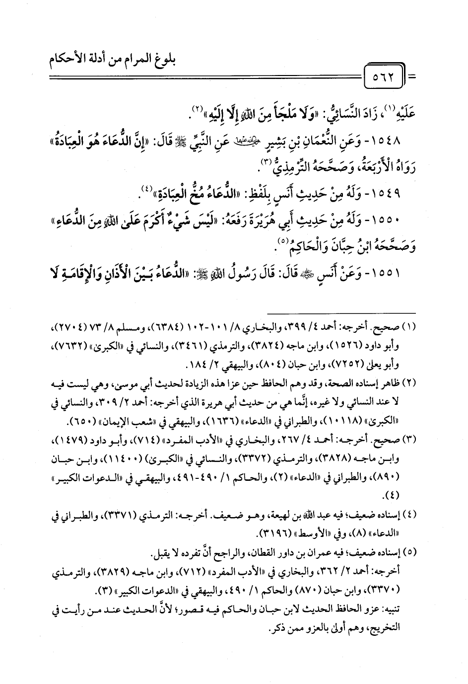 1548 - وَعَنِ النُّعْمَانِ بْنِ بَشِيرٍ رَضِيَ اللَّهُ عَنْهُمَا عَنِ النَّبِيِّ - صلى الله عليه وسلم - قَالَ: «إِنَّ الدُّعَاءَ هُوَ الْعِبَادَةُ» رَوَاهُ الْأَرْبَعَةُ، وَصَحَّحَهُ التِّرْمِذِيُّ (¬1).