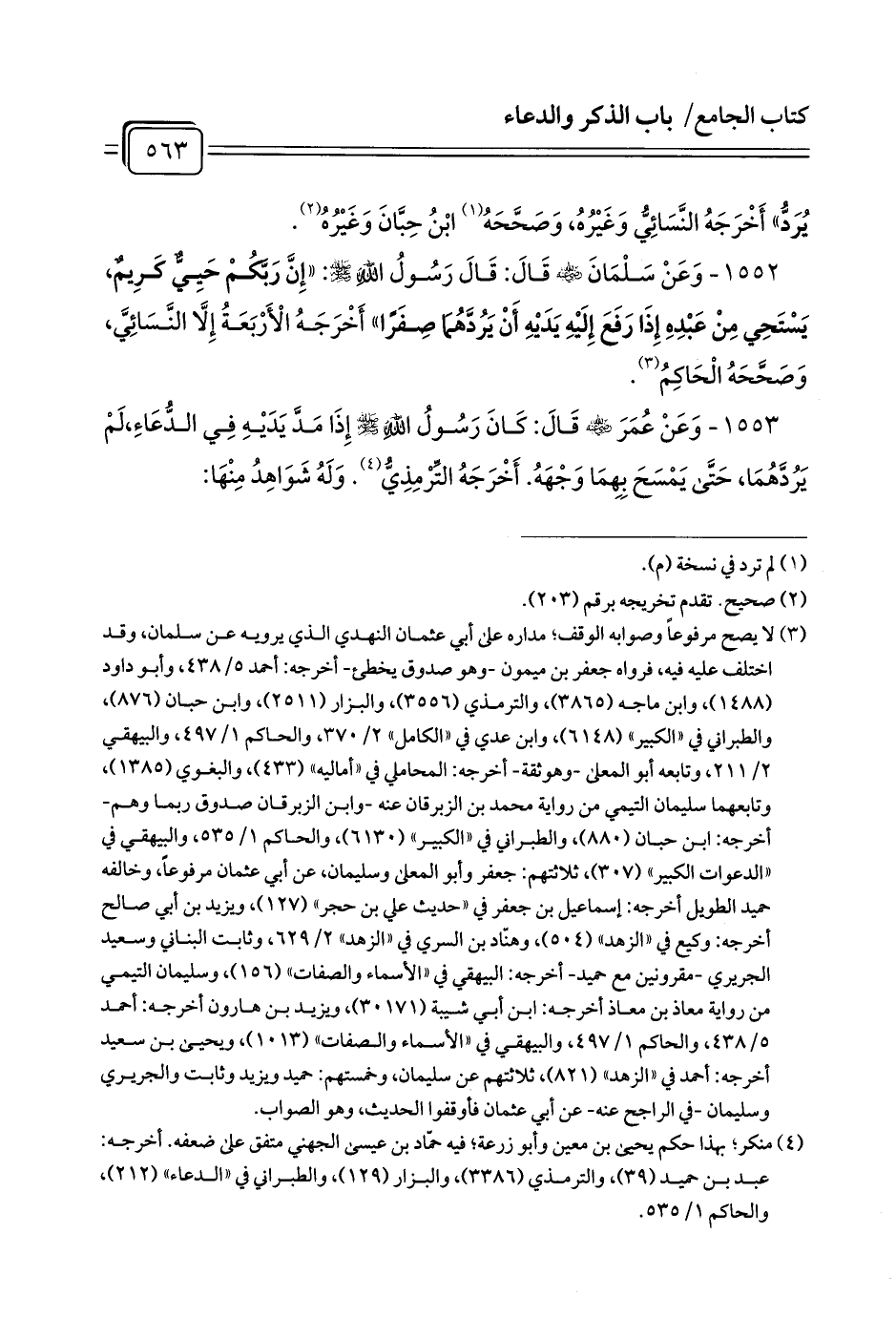 1552 - وَعَنْ سَلْمَانَ - رضي الله عنه - قَالَ: قَالَ رَسُولُ اللَّهِ - صلى الله عليه وسلم -: «إِنَّ رَبَّكُمْ حَيِيٌّ كَرِيمٌ، يَسْتَحِي مِنْ عَبْدِهِ إِذَا رَفَعَ إِلَيْهِ يَدَيْهِ أَنْ يَرُدَّهُمَا صِفَرًا» أَخْرَجَهُ الْأَرْبَعَةُ إِلَّا النَّسَائِيَّ، وَصَحَّحَهُ الْحَاكِمُ (¬1).
